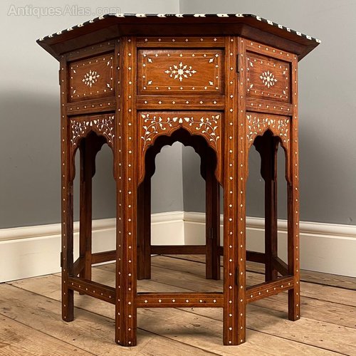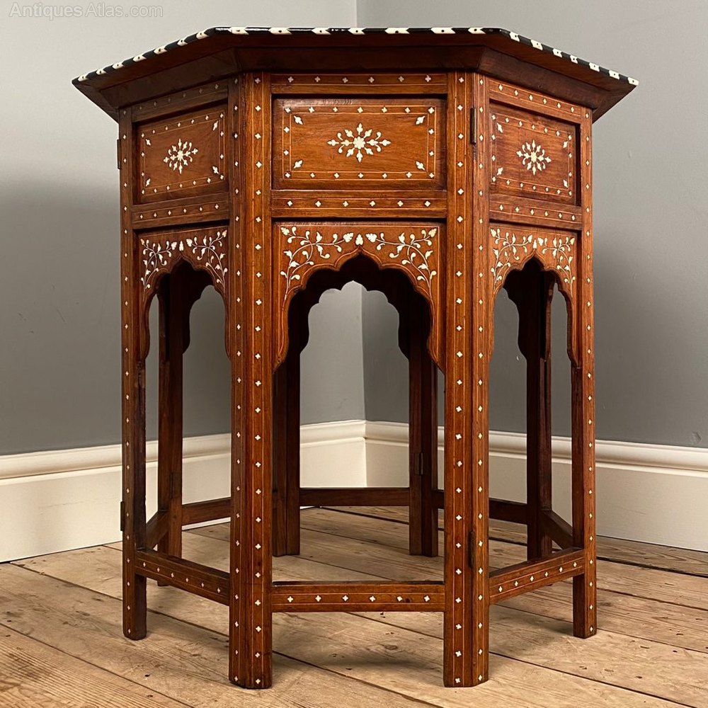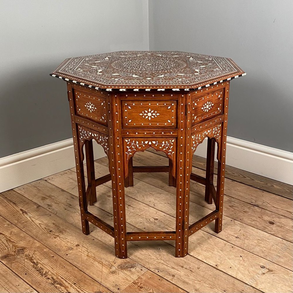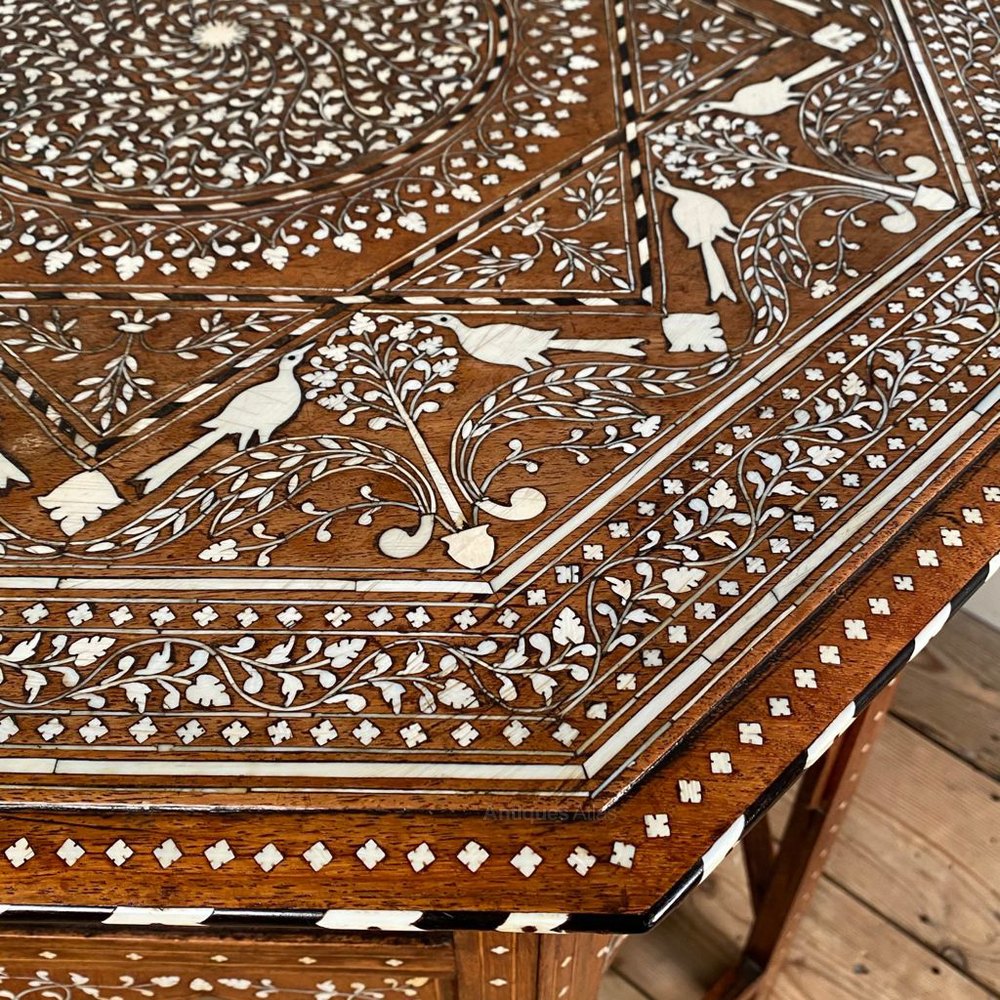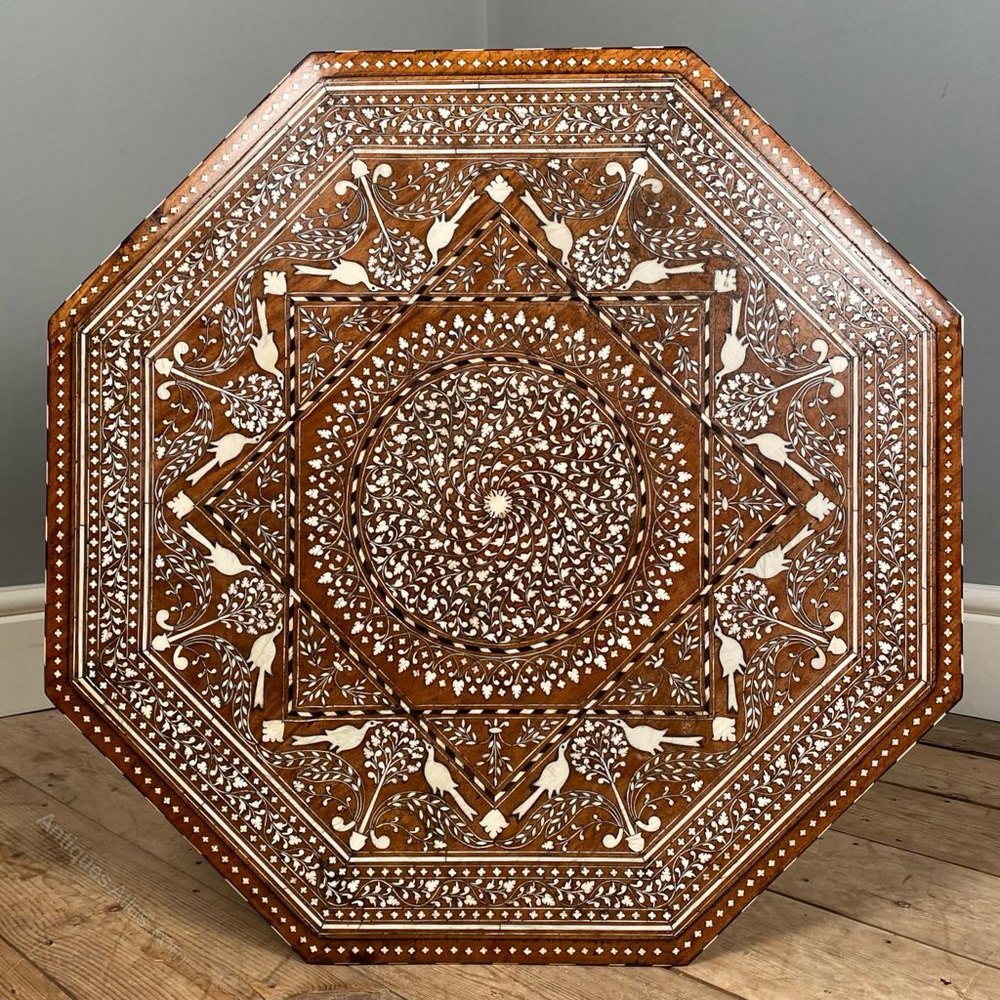 A late 19th century large folding Hoshiarpur table, profusely inlaid in Bone throughout. Having an octagonal top decorated with foliate and birds, with a Bone and Ebony Chevron moulded edge. The whole raised on 8 legs with panelled and shaped sides with further inlaid decoration. A very fine example in superb original condition throughout. Indian, Circa 1880.