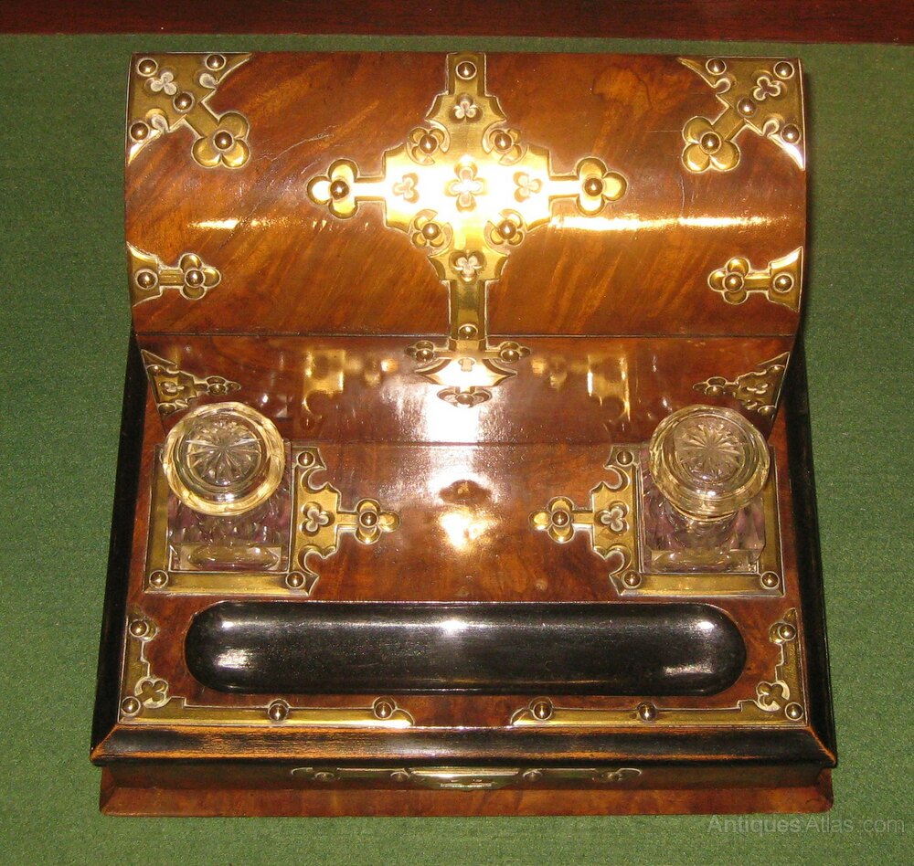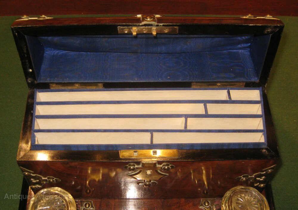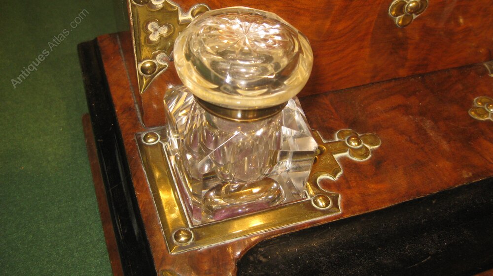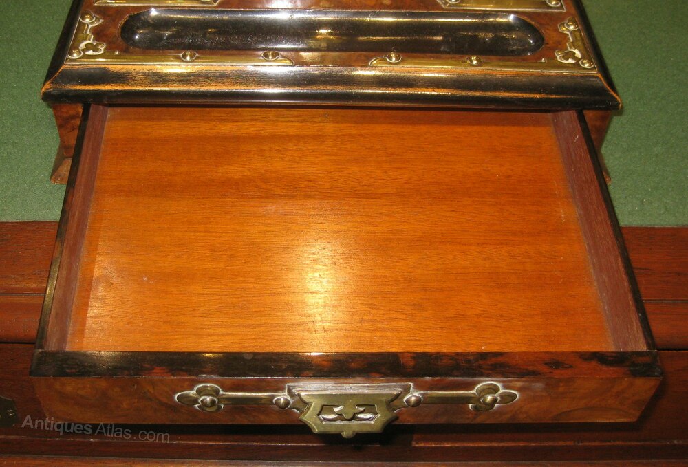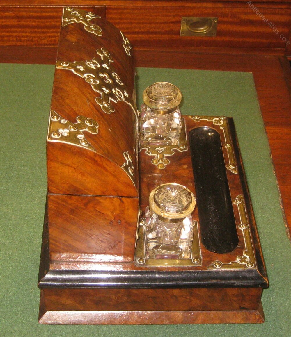 Beautiful Victorian walnut stationery cabinet and inkstand. The curved top opening to reveal stationery compartments in lovely condition. With 2 original lidded inkwells and pen tray. With a single drawer of a fine, hand cut, dovetailed construction with mahogany linings. All over with beautiful brass decoration.