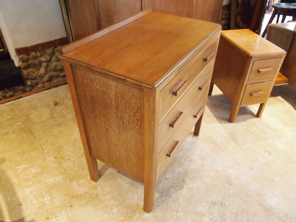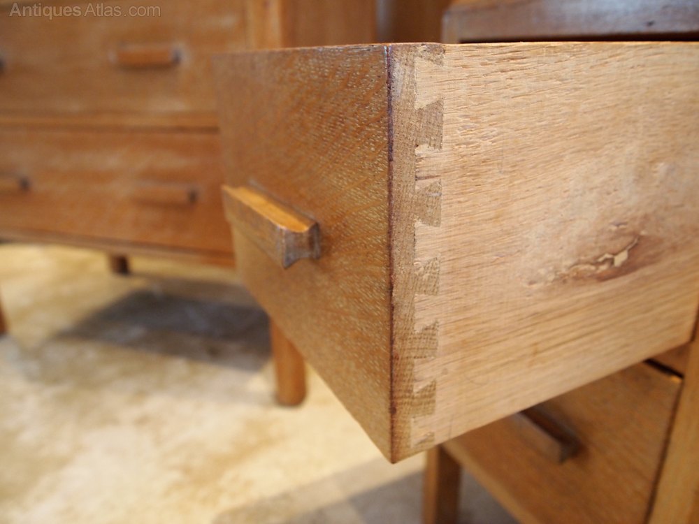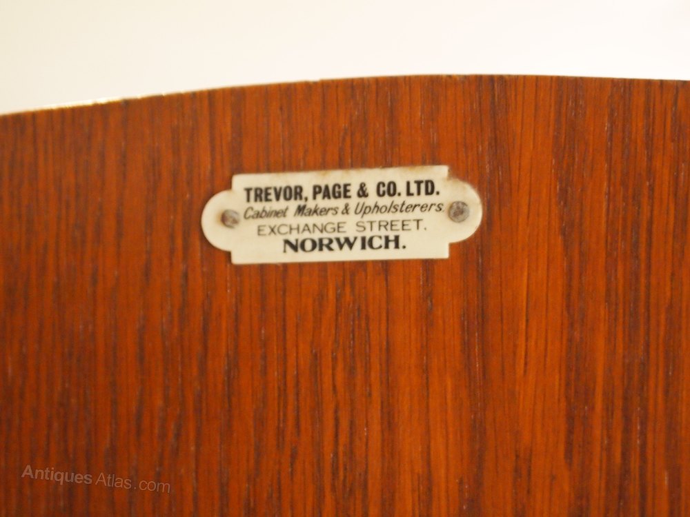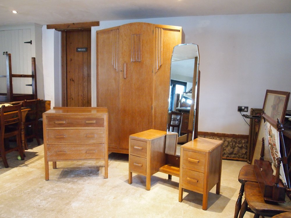 Here we have a fine quality limed Oak bedroom suite in the manner of Heals but made by Trevor Page of Norwich c1920. As you can see the antique furniture has great colour and patina. Being of close proximity to Norwich we have had many items of Trevor Page furniture through our business. The one thing that is always apparent is the quality of the cabinet making and the quality of the timber used. The caracasses are made from quarter sawn Oak with limed finish. The sides of the drawers are all solid Oak as are the drawer bases. The rear of the wardrobe is fully panelled. All peices have Trevor Page labels and all are in great retail condition ready for your home. The dimensions are approx