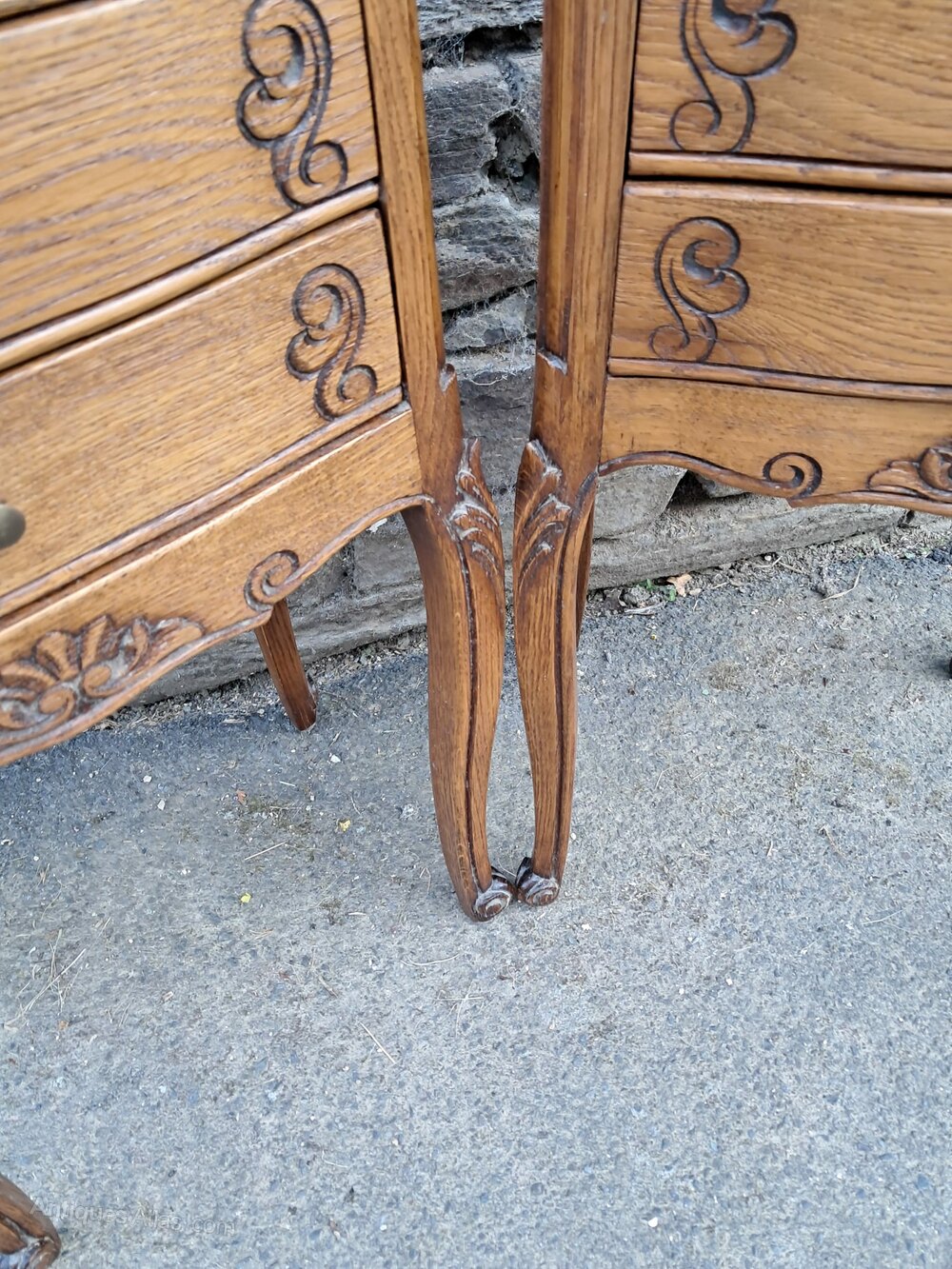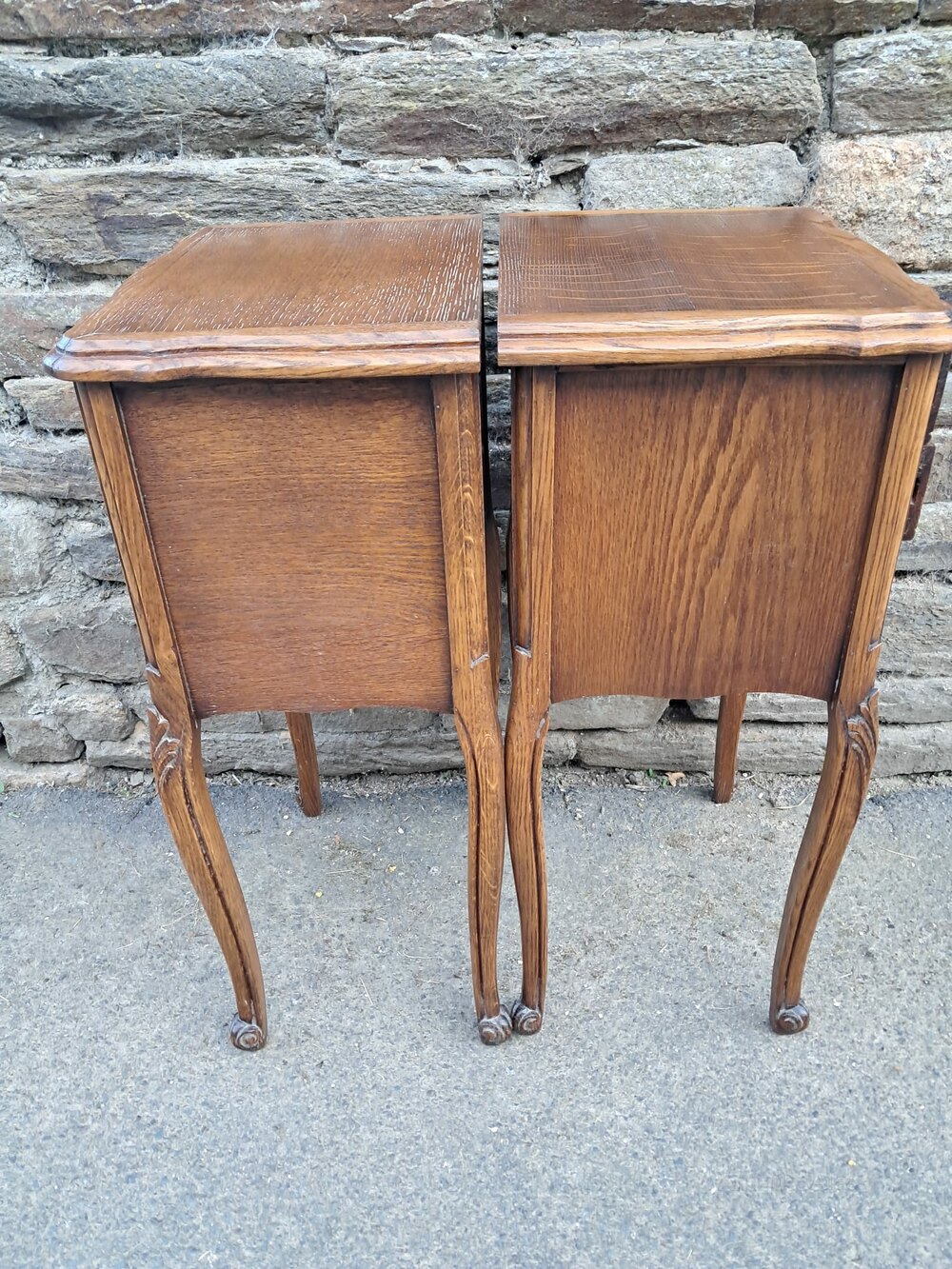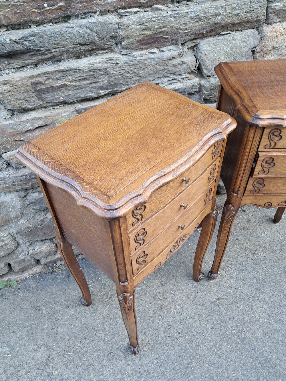 A very good pair of French oak bedside chests each having three good useful drawers. Both chests are in a mid oak finish, in perfect condition and ready for use.