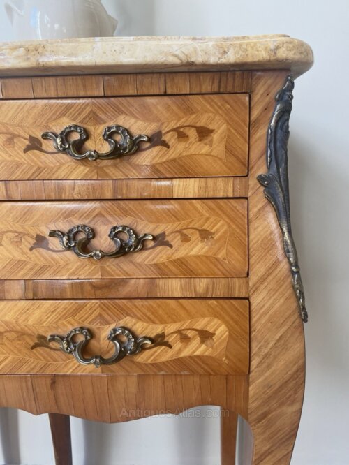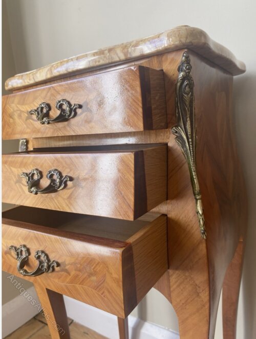 A good pair of French three drawer marquetry chests of drawers , bombe shaped with ormolu mounts, in excellent overall condition bedsides some small patches of wear to the sides predominantly. Removable Solid marble tops in good condition. All drawers run smooth and are clean throughout. This is a fabulous decorative pairing if you’re looking for a grand bedroom statement.
