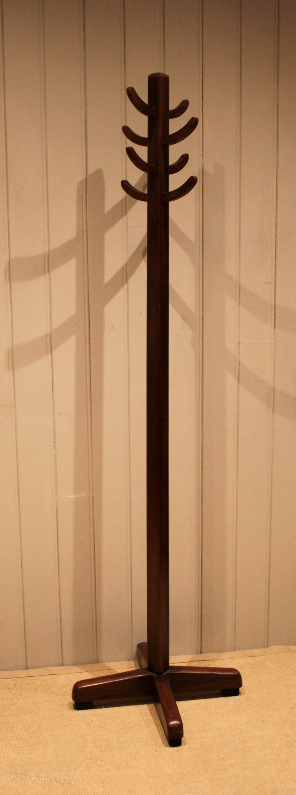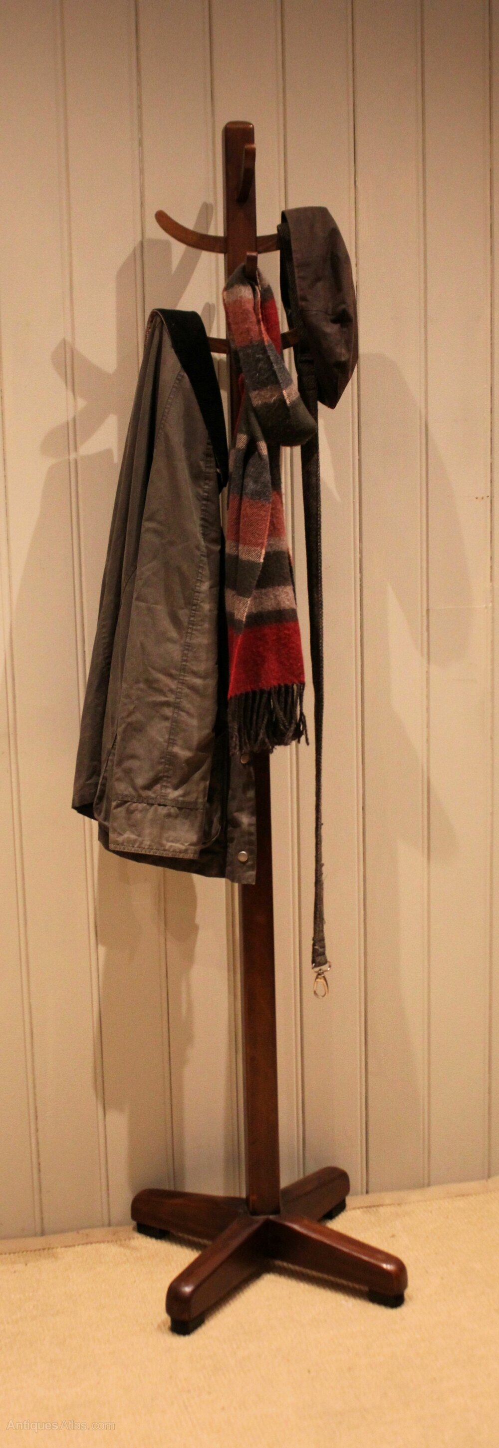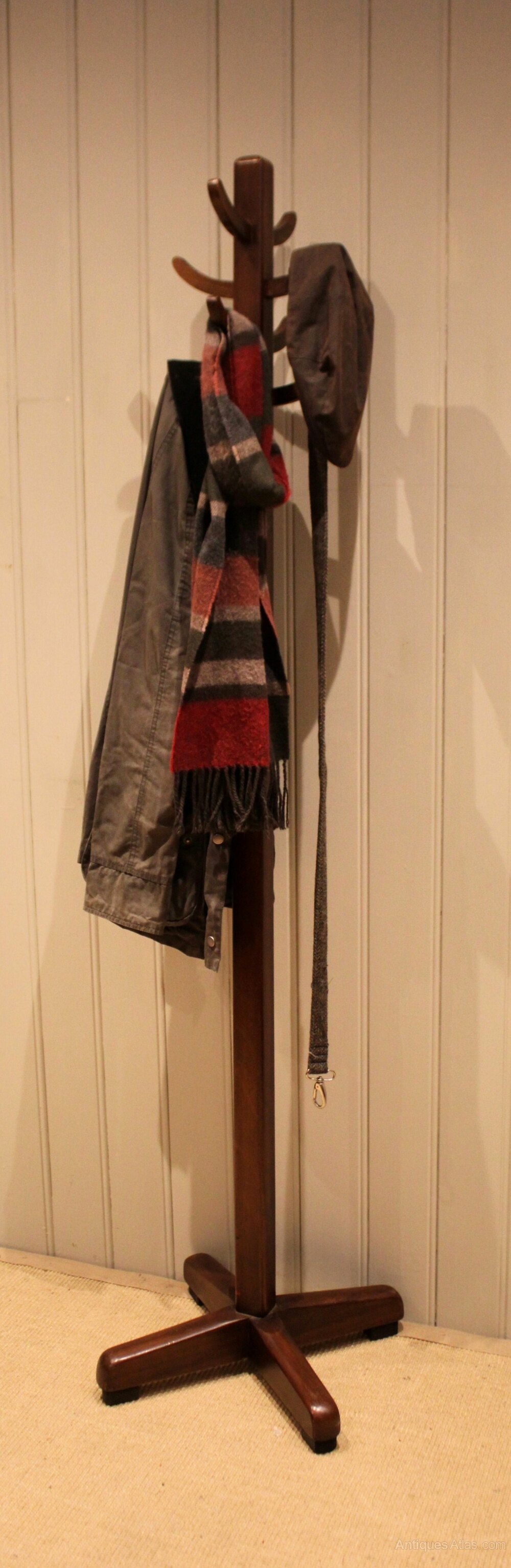 Beech & Oak coat stand having eight wooden coat and hat hooks raised on a crossed solid stand .