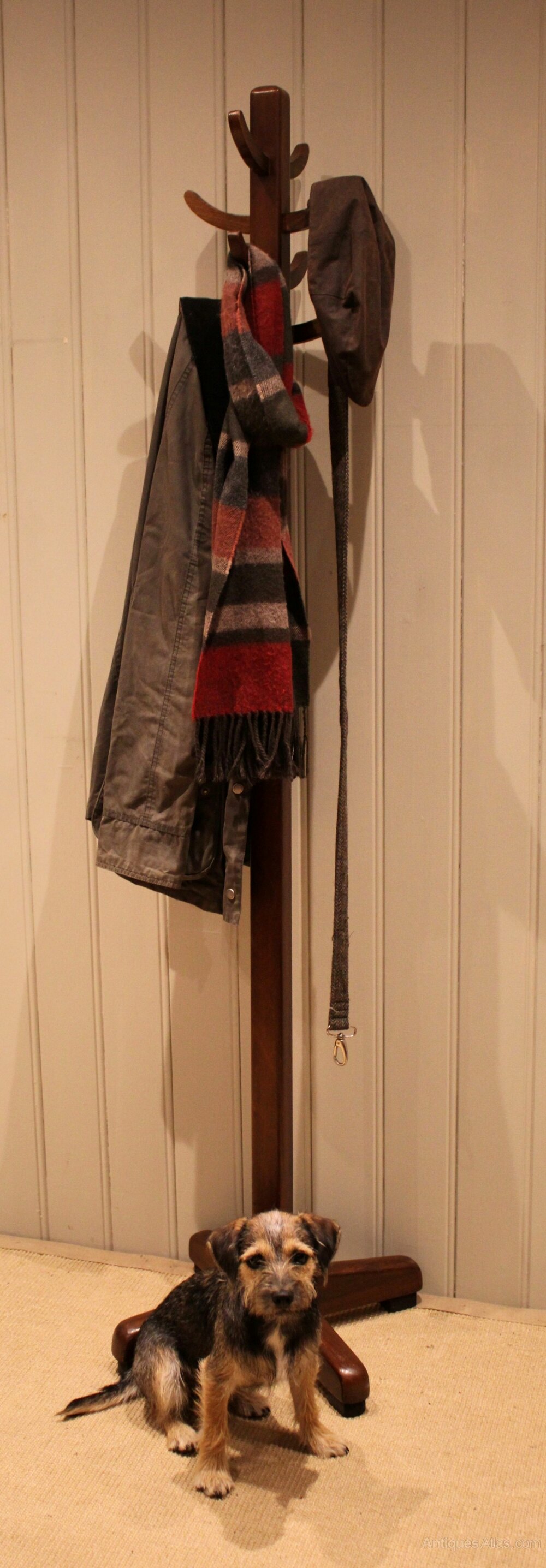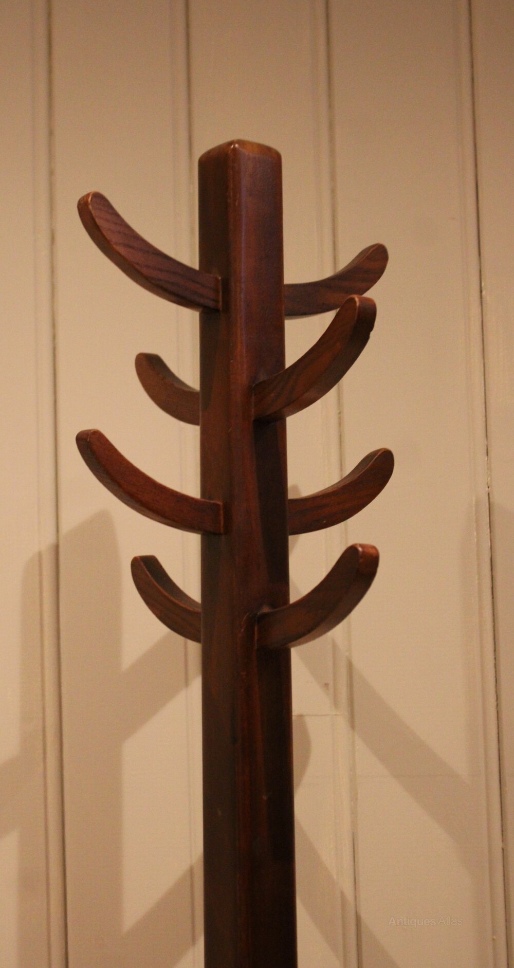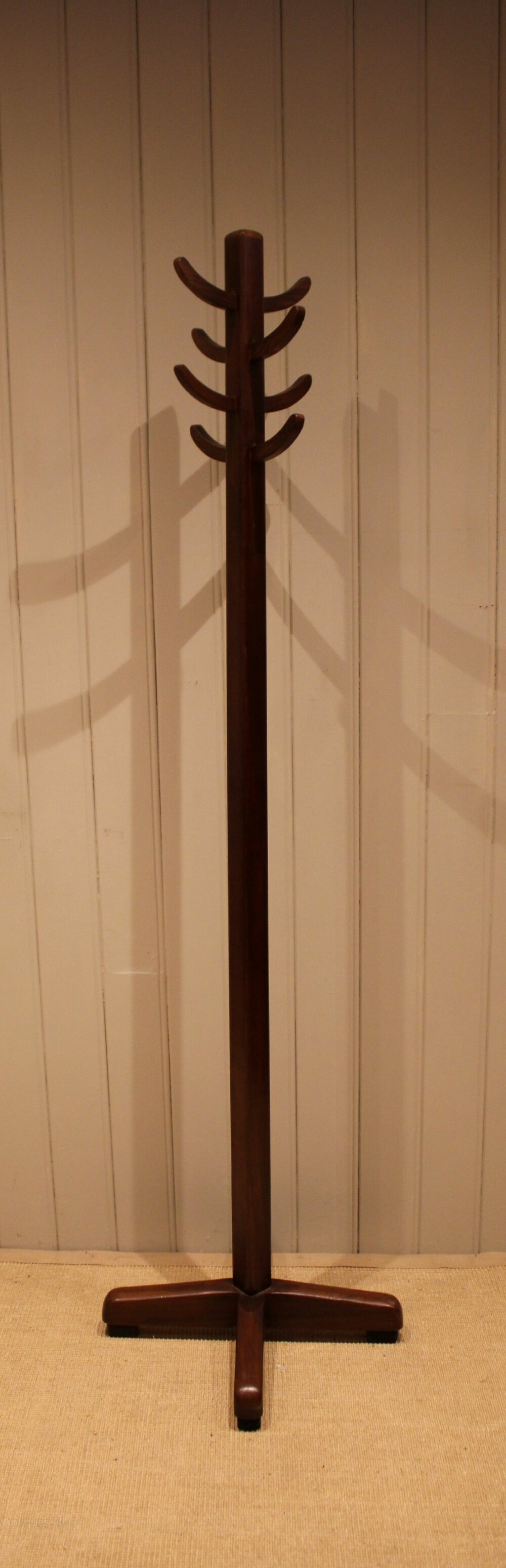 Beech & Oak coat stand having eight wooden coat and hat hooks raised on a crossed solid stand .