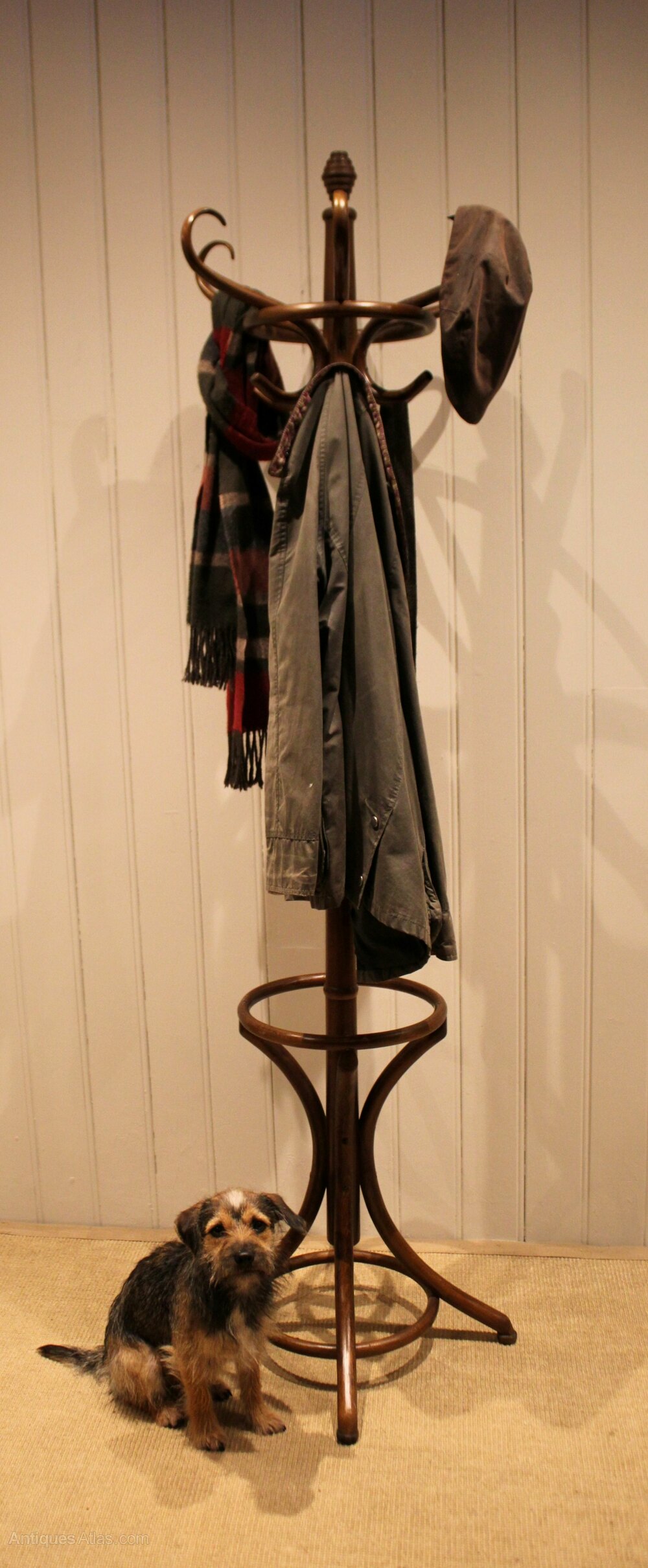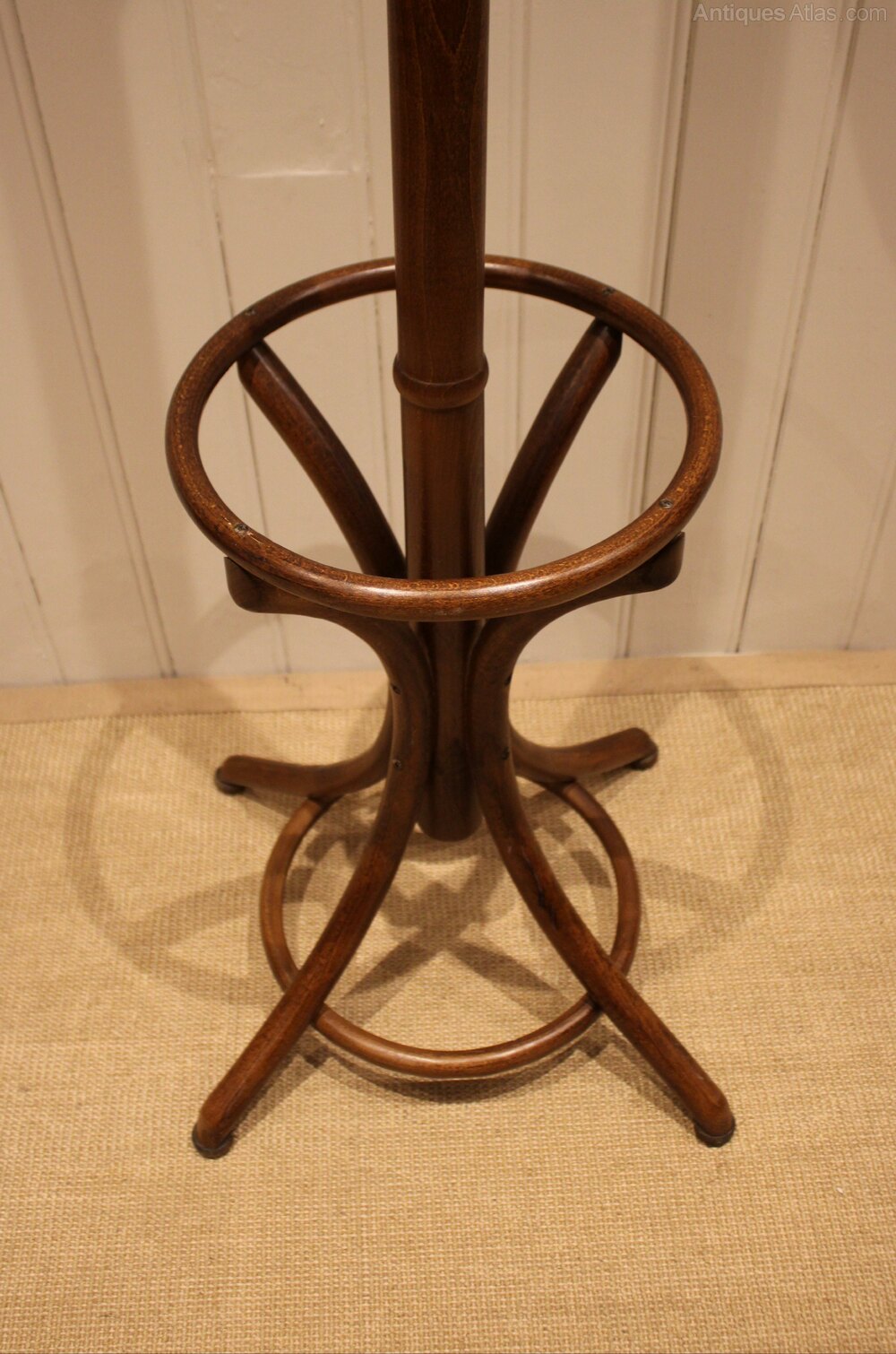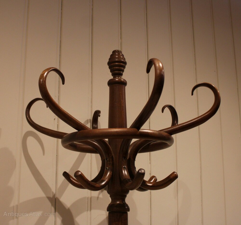 Bentwood beech hat and coat stand having a rack to the top with twelve hooks for coats and hats , with a stick stand to the base .