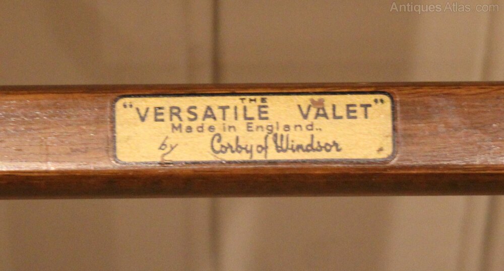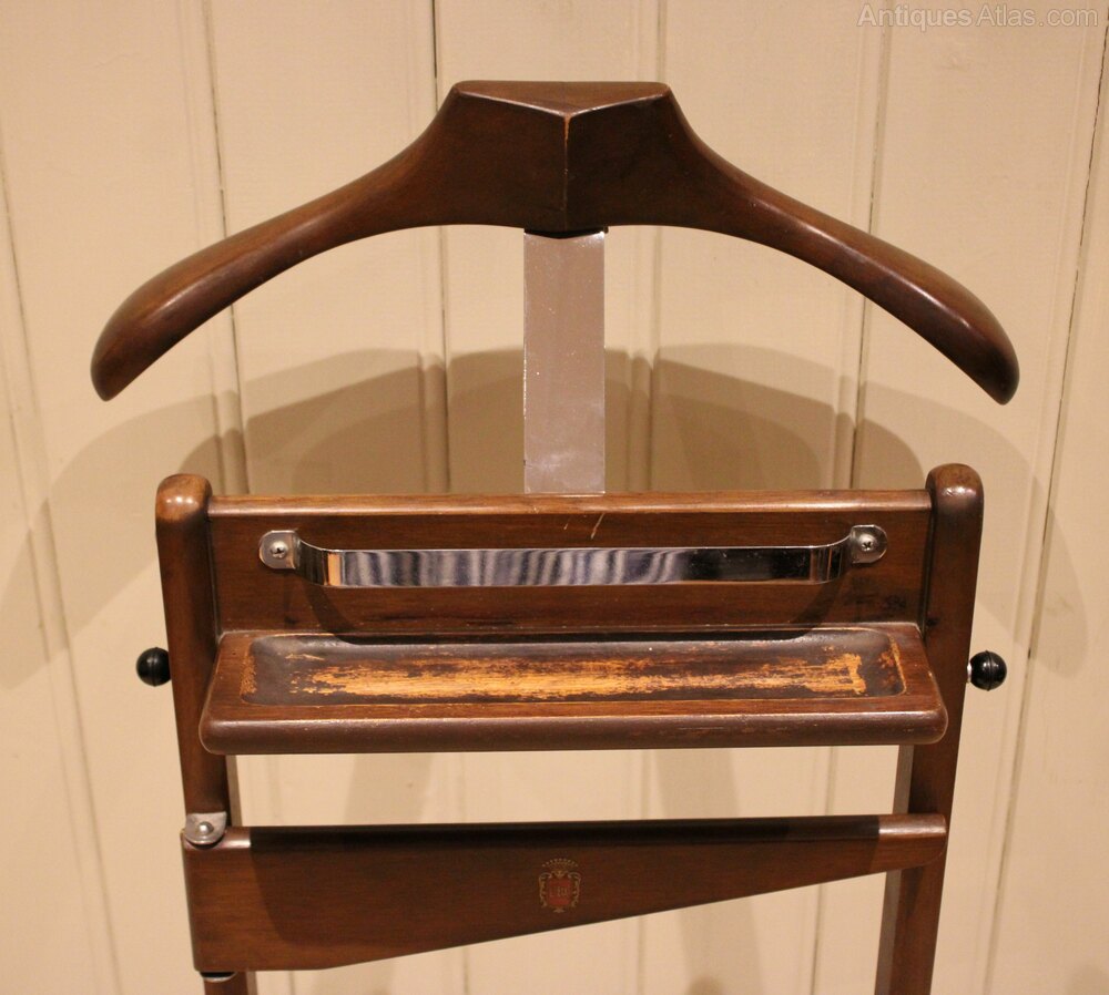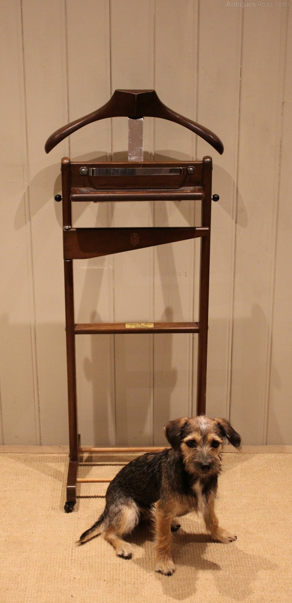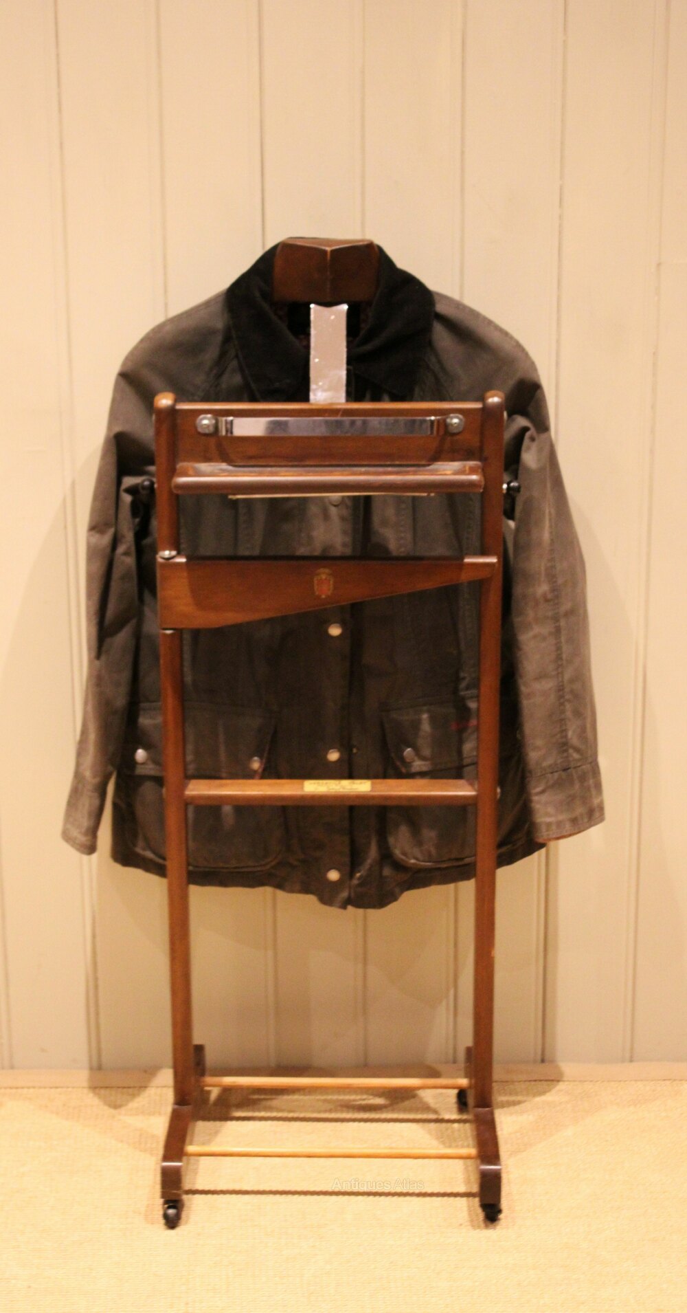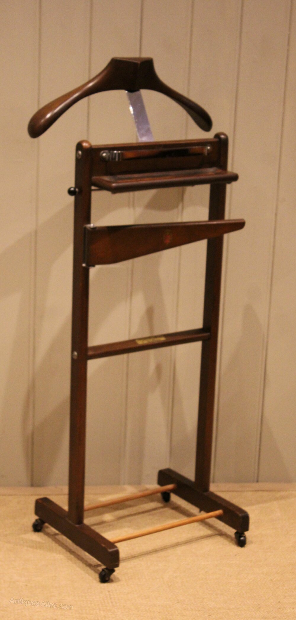 Beechwood valet stand with cross-stretchers providing a shoe rest at the base, the frame incorporates a shirt/jacket hanger, trouser bar and a top rail with small extending brass rods on either side on which to hang a tie and belt
