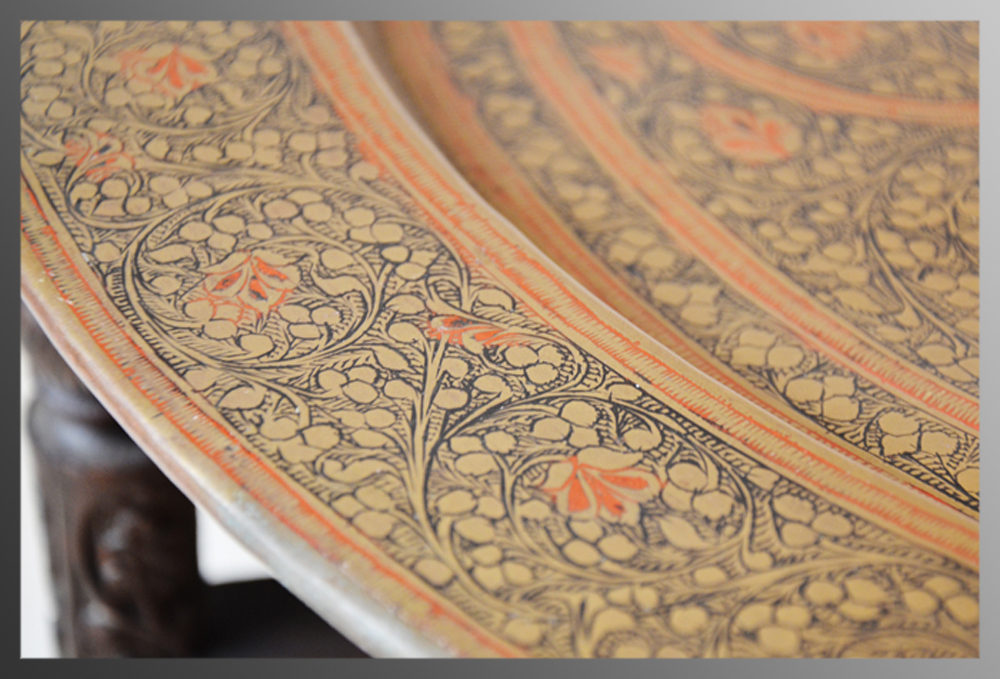 The berber brass top features gorgeous engraved design work displaying great intricacy. There is accented colour throughout and the piece features a peacock in full display as the central theme. The tray sits atop the intricately carved six leg folding base and can be lifted for serving purposes.