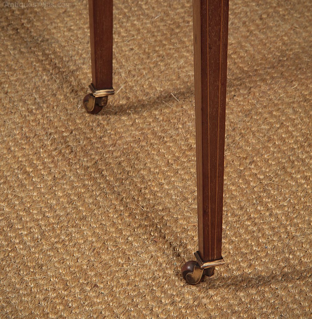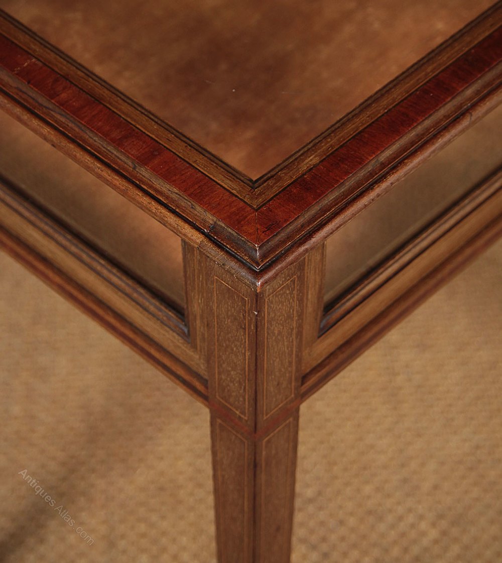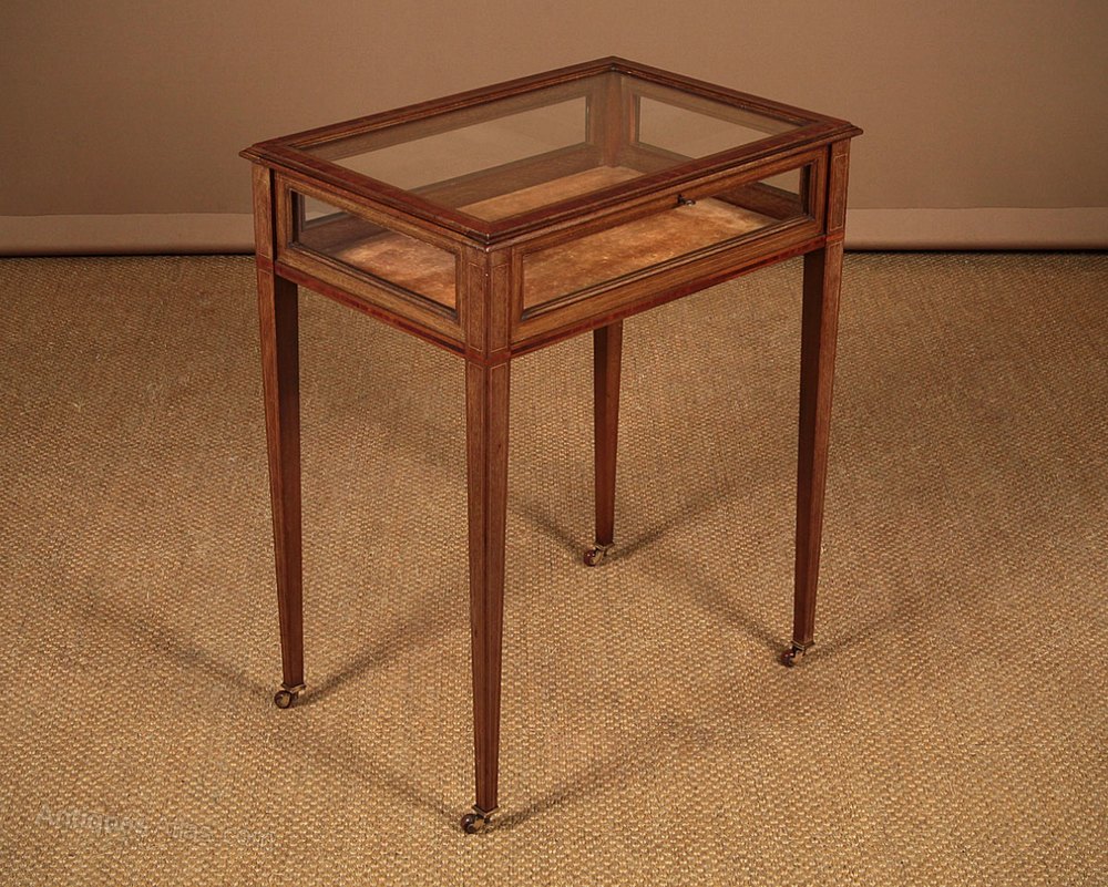 Superb quality mahogany bijouterie or display top table c.1905. Slim display top (internal height 12cm) with a glazed top, front, and sides. Inlaid and crossbanded top with a moulded edge. Inlaid and crossbanded detail continued on all four sides and to the slim tapering legs front and rear. Raised on the original castors. Original lining fabric. Excellent colour and condition, cleaned and waxed in our workshops. Key supplied.