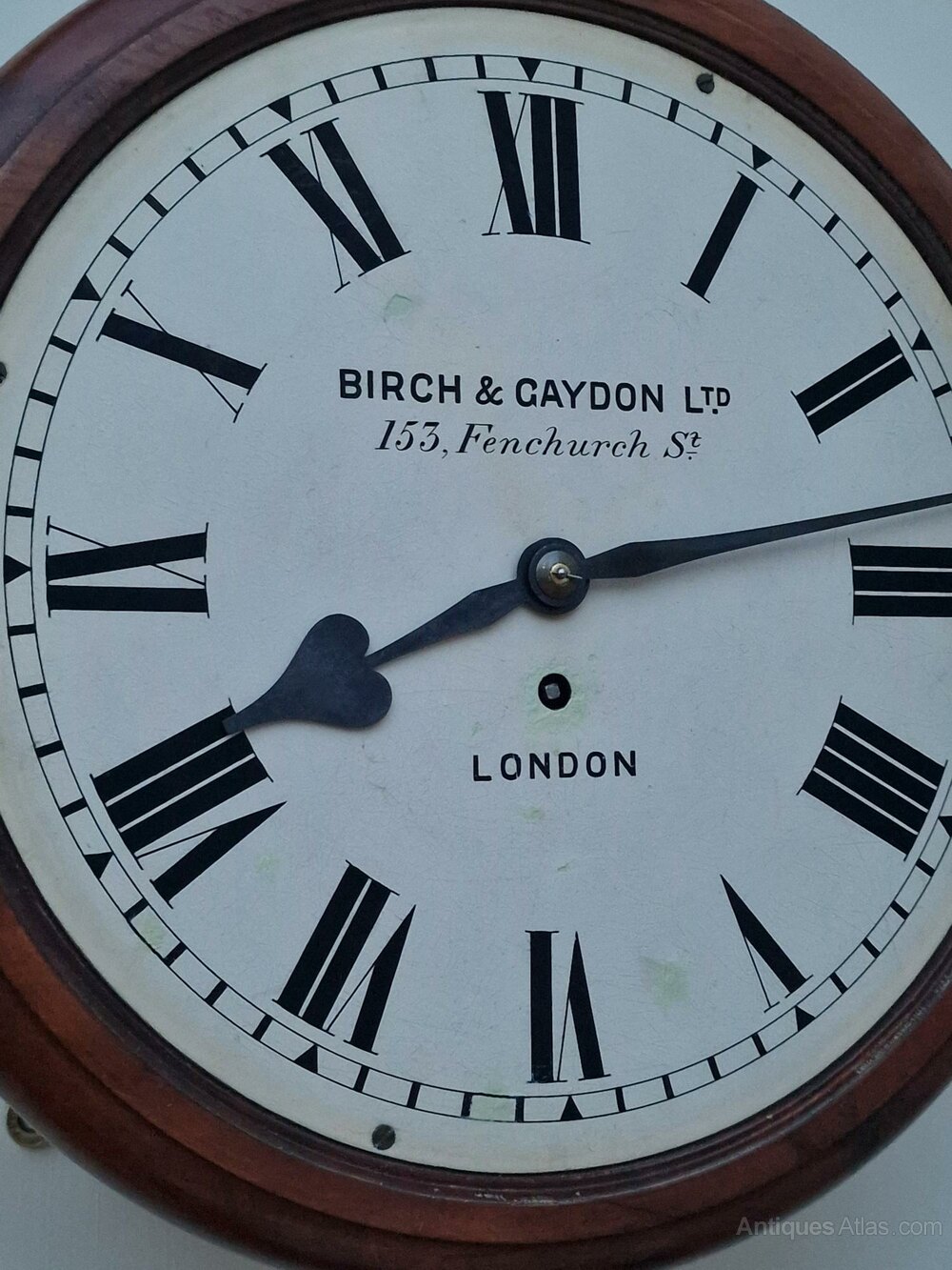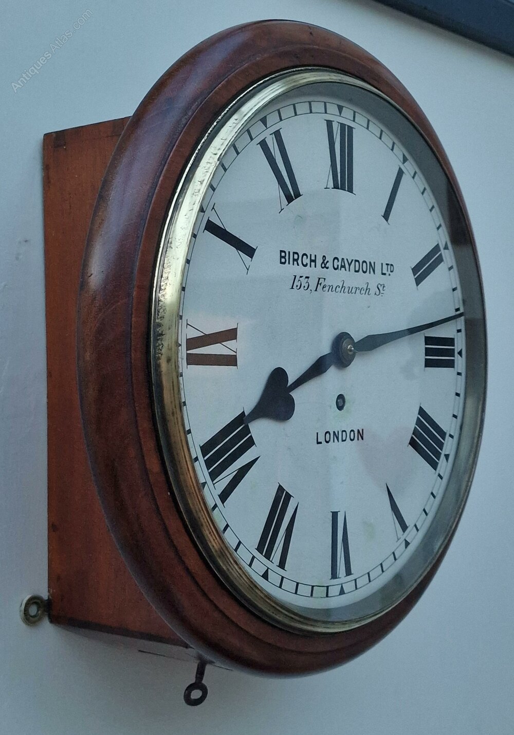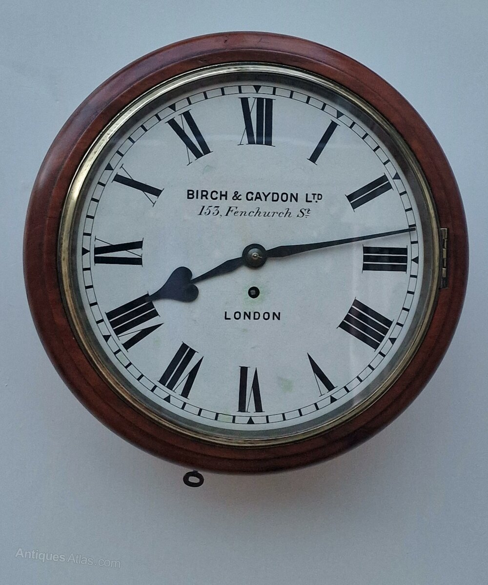 A Victorian fusee dial wall antique clock. A 12" painted dial signed BIRCH & GAYDON LTD 153, FENCHURCH ST LONDON'' with blued steel hands. A mahogany case case of good colour with a cast brass bezel surround. An 8-day duration fusee timepiece mechanism. Circa 1880.