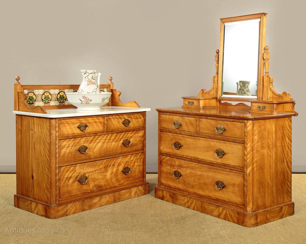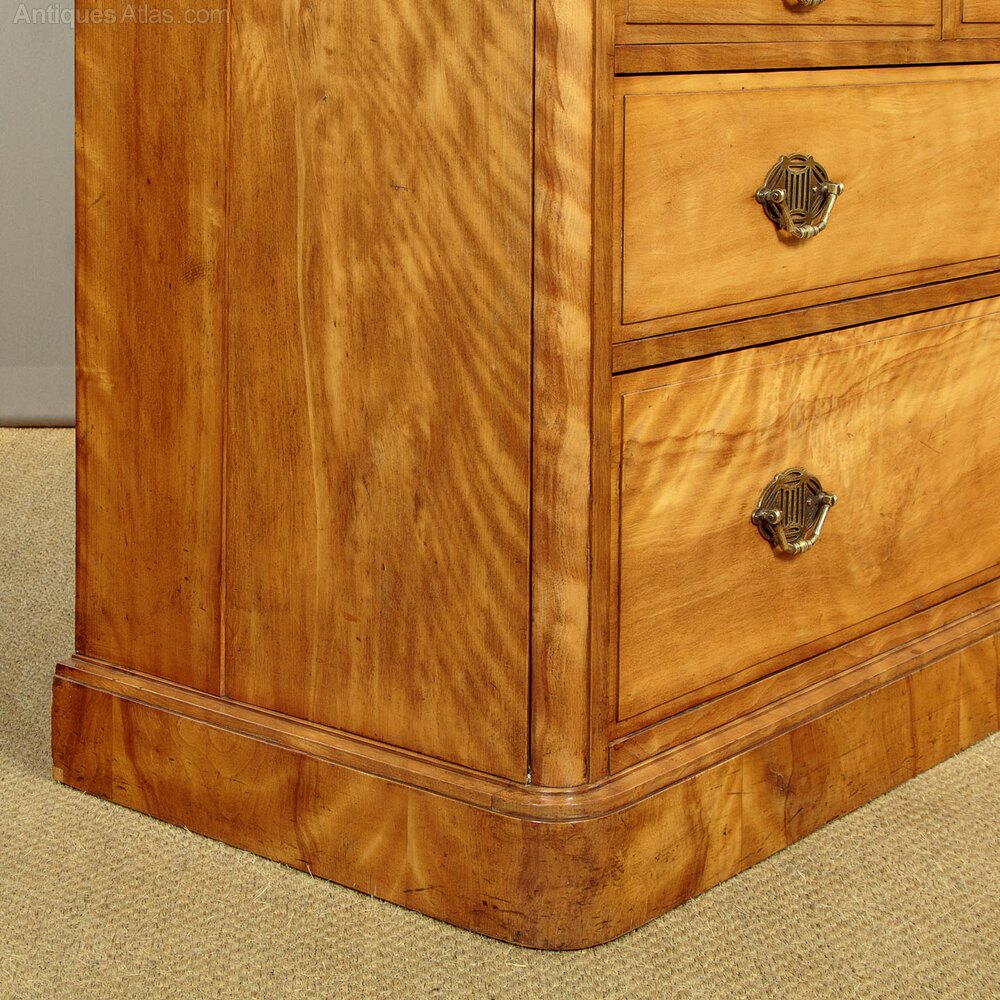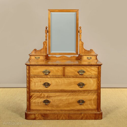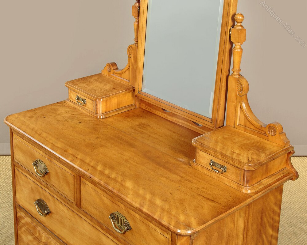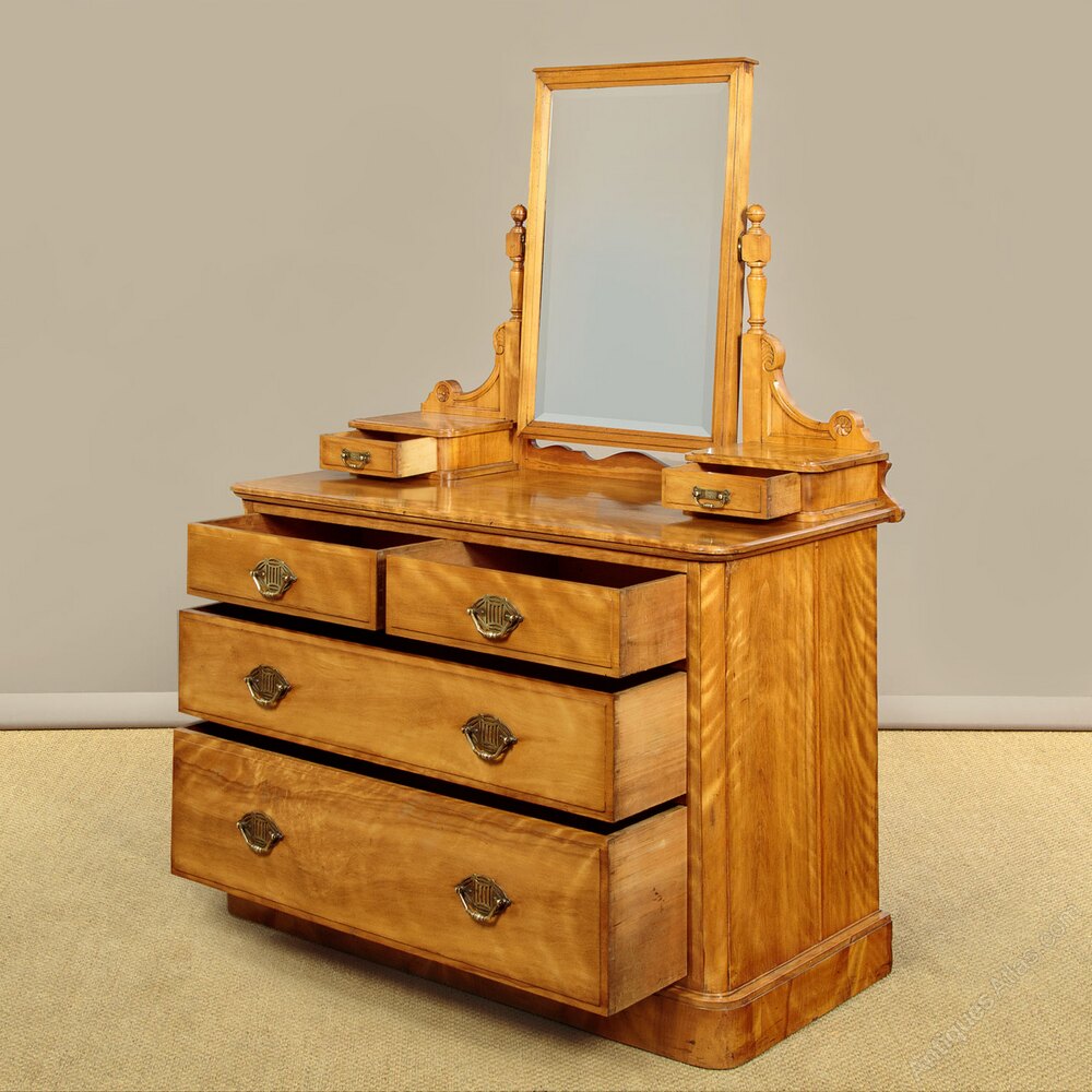 Late 19th.c. English dressing table chest of drawers in satin birch c.1880. Original 15½" x 25" bevelled mirror within a moulded frame, angle adjustable on turned supports with shaped and carved brackets and two small drawers. Over a chest of two short and two long drawers of graduated height. Solid birch top with particularly attractive satin grain continued on the drawer fronts which also retain the original brass handles. Solid birch sides and a moulded and crossbanded veneered plinth. Excellent colour and condition, cleaned and waxed in our workshops.