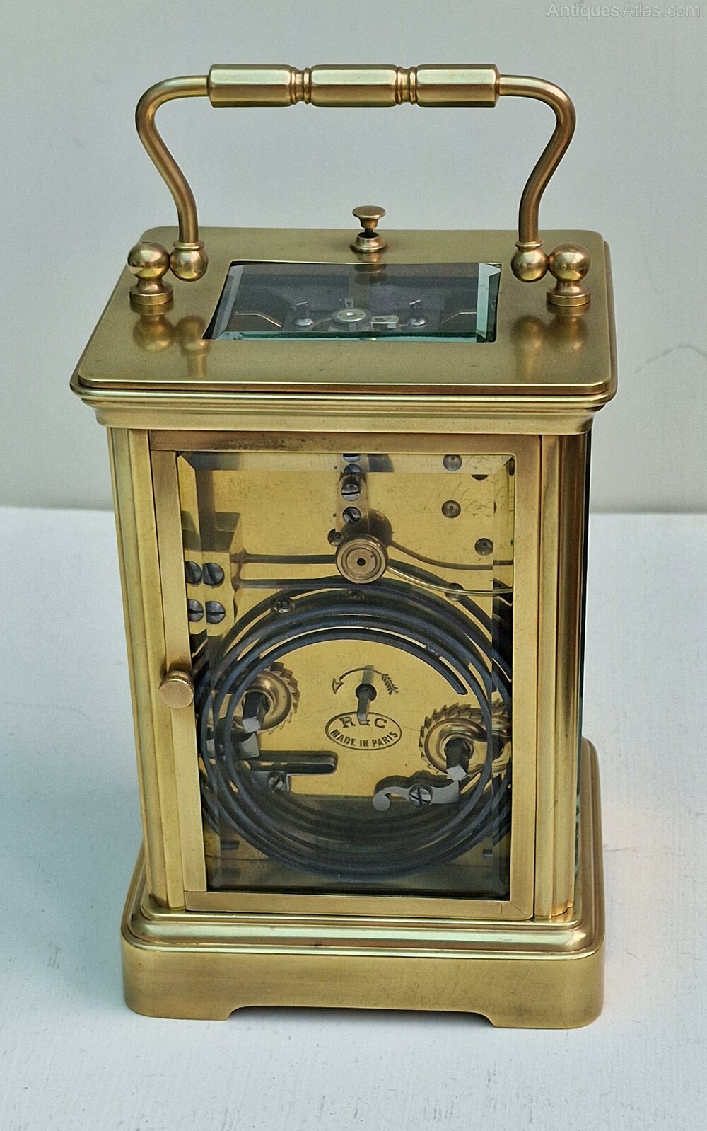 A French brass cased striking & repeating carriage clock. An enamel dial with Roman numerals and blued steel hands. Signed to the dial by the retailer 'Bishop Bournemouth' .The original travelling box. An 8-day duration mechanism striking the hours and 1/2 hours on a gong by Richard & Co, Paris. A lever escapement visible through the square top glass. A repeater button to the top. Circa 1900.