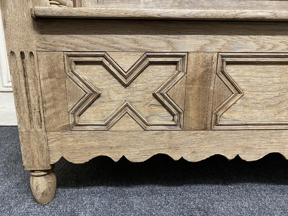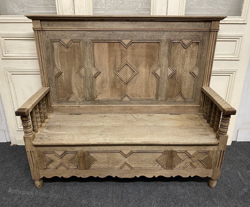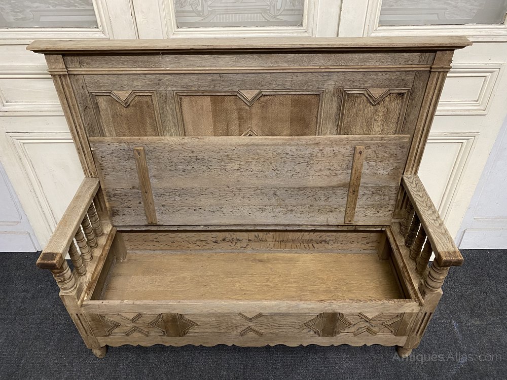 A lovely French Bleached Oak Hall Bench or Settle having box seat with lift up lid storage area. Dating to the late 19th Century and in excellent condition for the home.