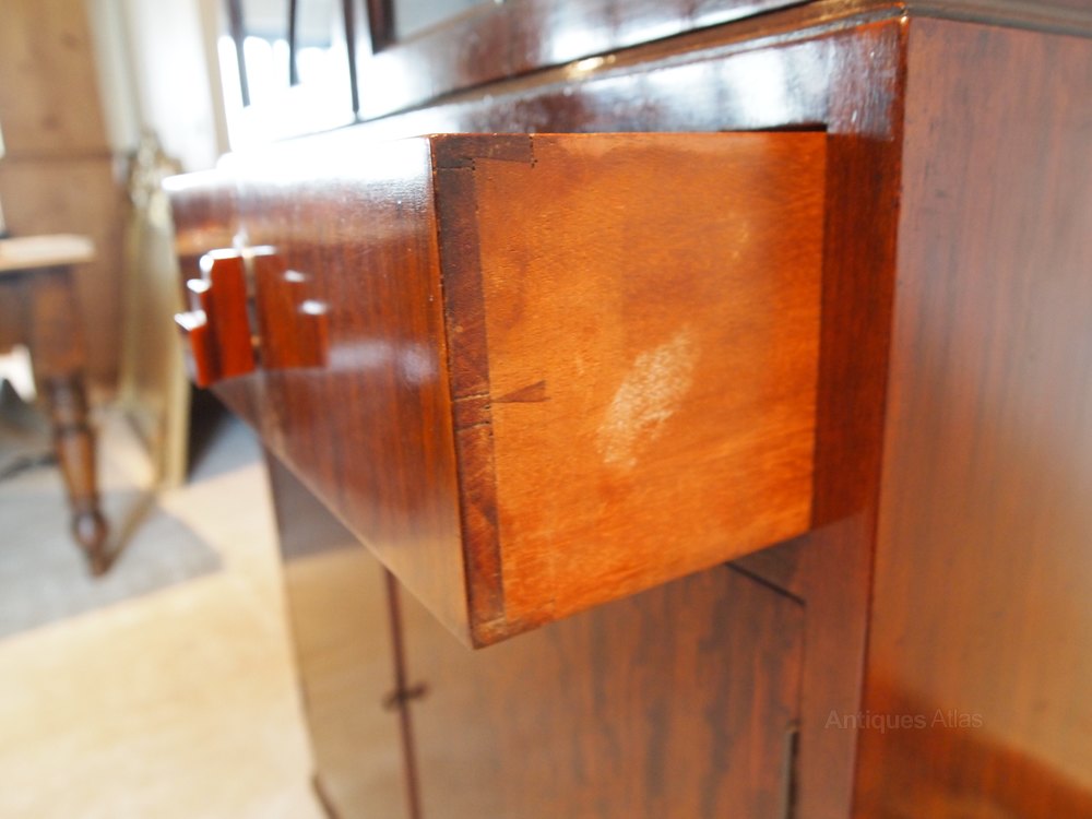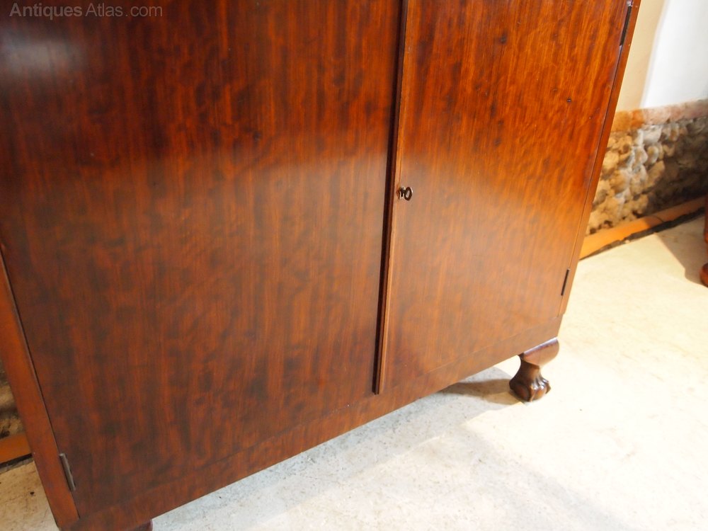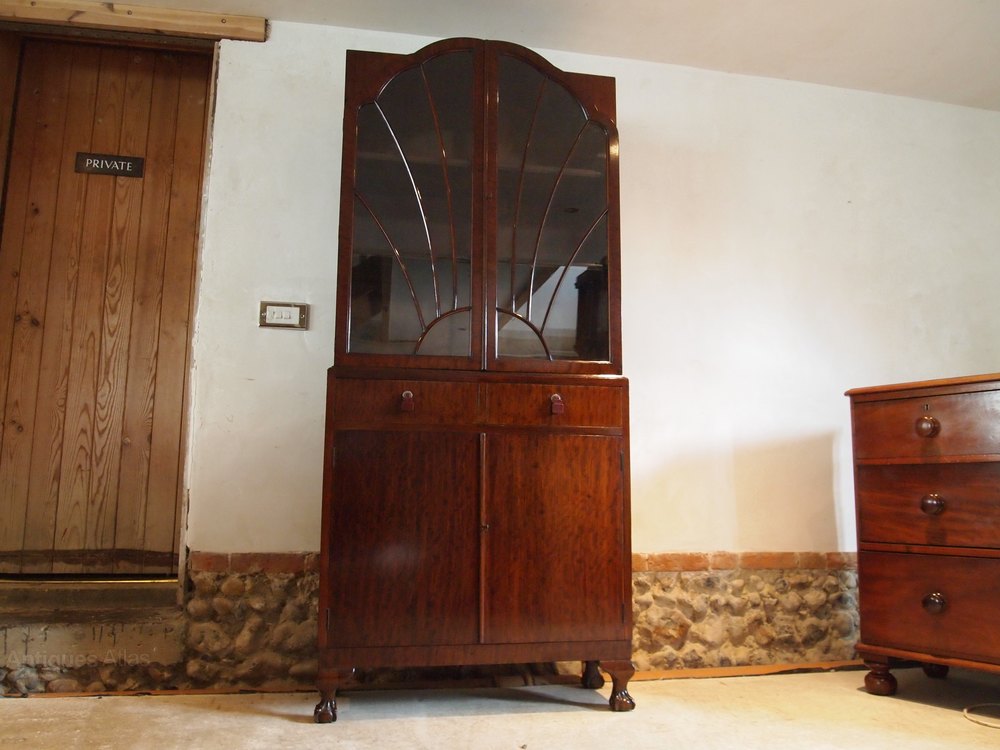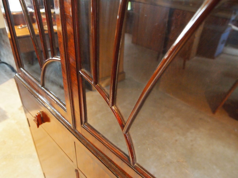 Here we have a fine quality Art Deco plum pudding Mahogany bookcase by Leonard Davis c1925. As you can see the bookcase has super colour and patina. Leonard Davis made this bookcase for the firm of E Davis 17 Austin Street London E2 which later became E Davis and Sons Furniture Ltd. There is a domed top with two beautiful astragal glazed doors incorporating a stunning Art Deco sunburst. The bookcase is veneered in beautiful plum pudding Mahogany which has wonderful grain and colour. The top has adjustable shelves and below there are two drawers with handcut dovetails and original stepped handles. The base has two doors and a shelved interior and a base finished with claw and ball feet. There are two original working locks and original keys. A super period Art Deco bookcase of excellent proportions in great retail condition ready for your home. The dimensions are approx 74 inches high 32 wide and 12 deep.