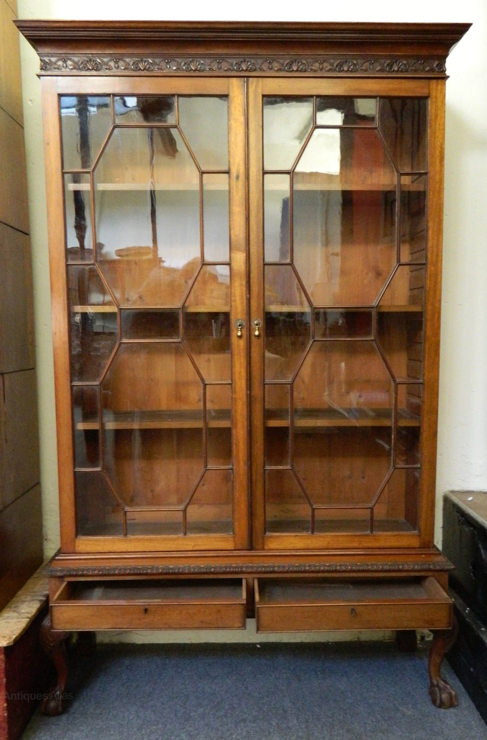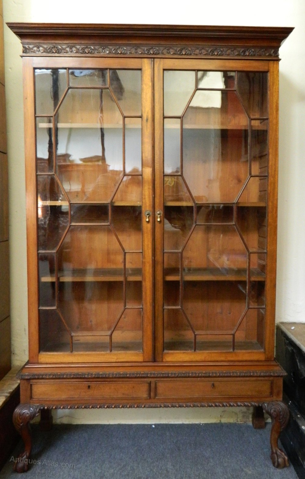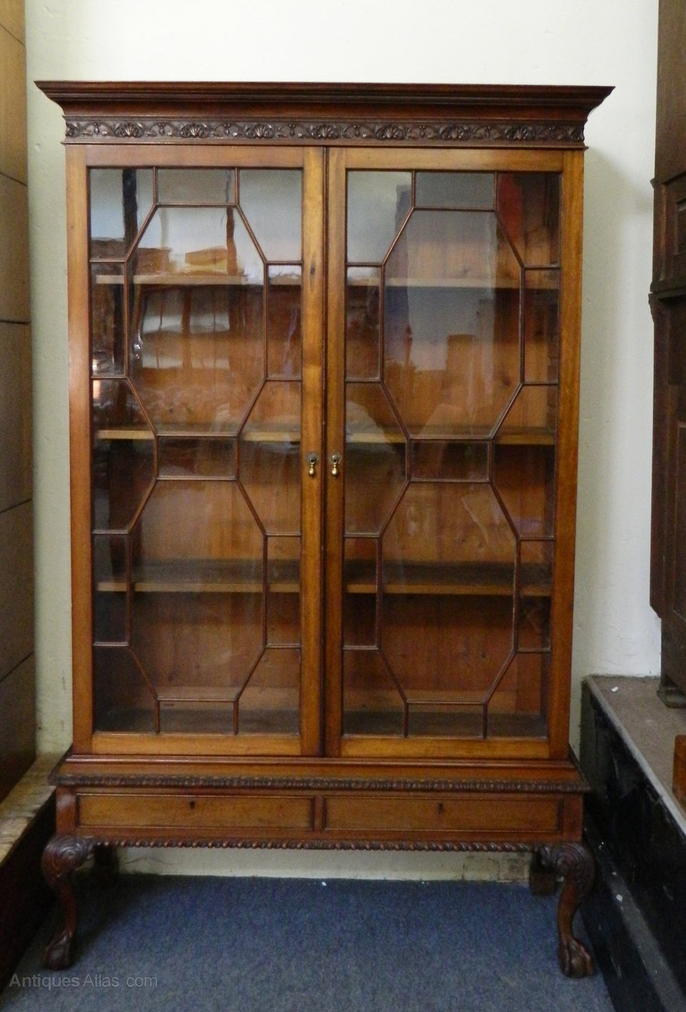 the flared cornice with decorative carved detail over two astragal glazed doors opening to adjustable shelved interior.