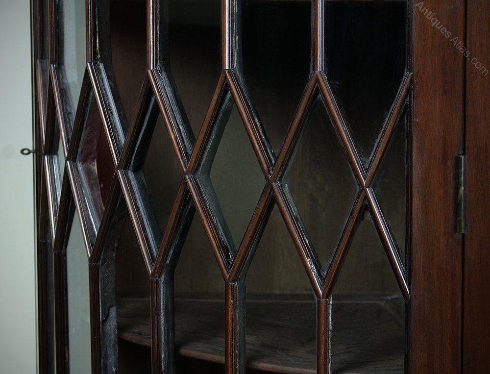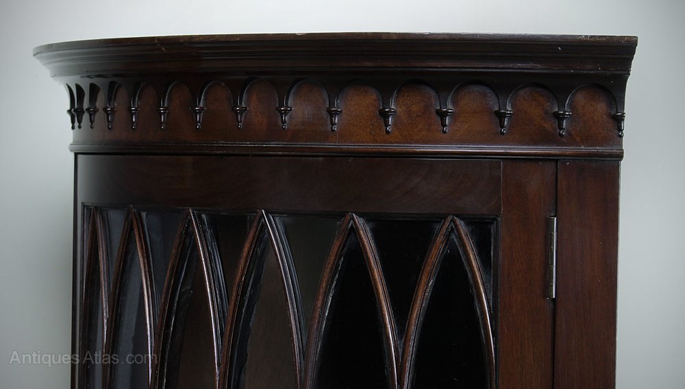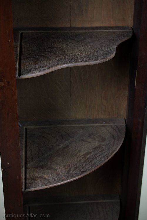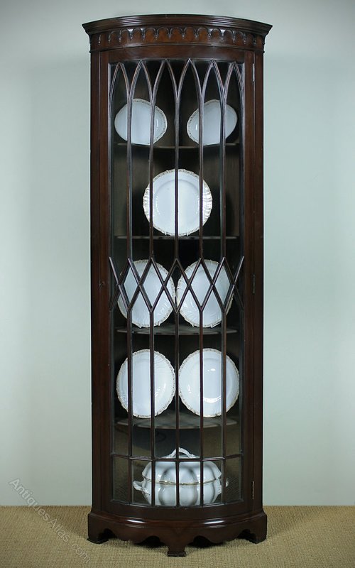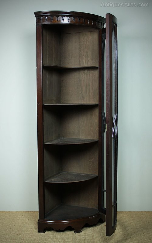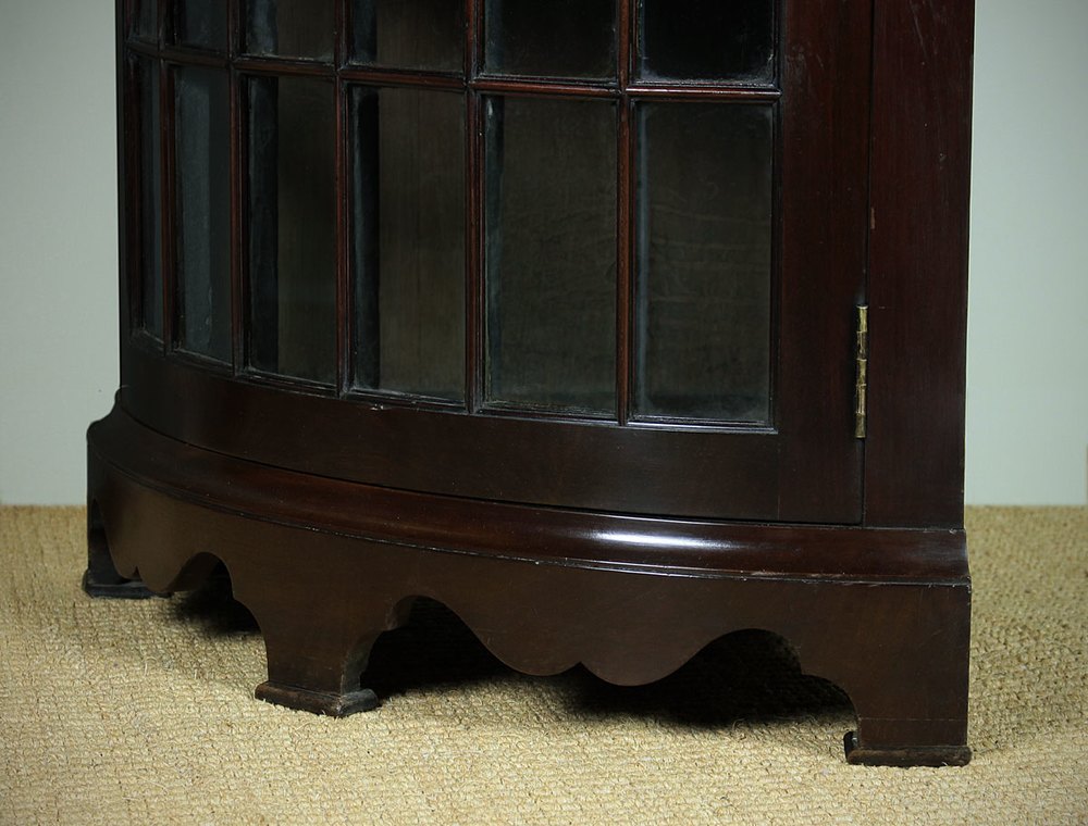 Excellent quality Edwardian mahogany glazed double height corner display c.1910. Carved cornice over a full length bow front door with 32 individually glazed panels. Solid oak backboards, shaped shelves and shaped detail to the feet. Excellent colour and condition, cleaned and polished in our workshops. Key supplied.