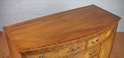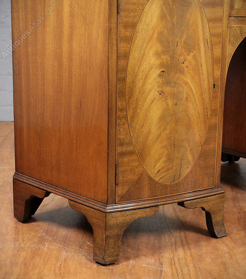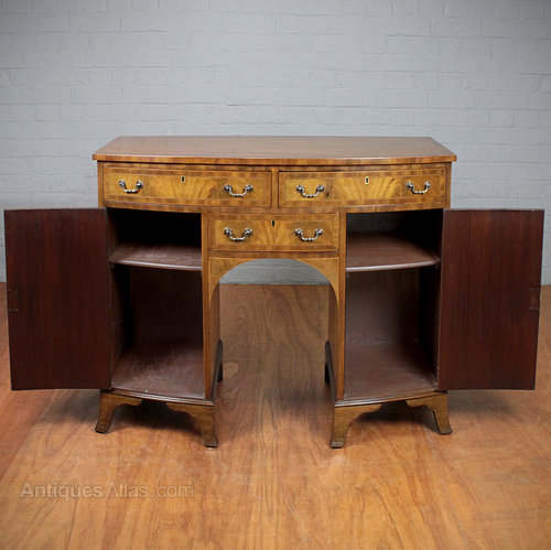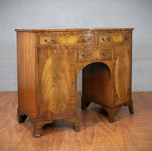 Super quality little early 20th.c. bow front mahogany kneehole desk c.1920. Two drawers over a small centre drawer flanked on each side with cupboards. Crossbanded and inlaid matched flame mahogany door and drawer fronts mellowed to a lovely honey colour. Excellent condition, cleaned and polished in our workshops. Keys supplied.