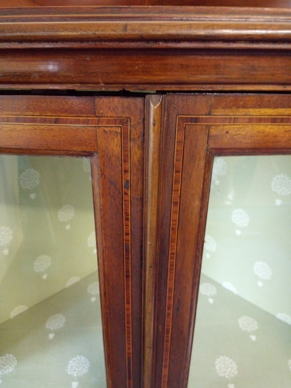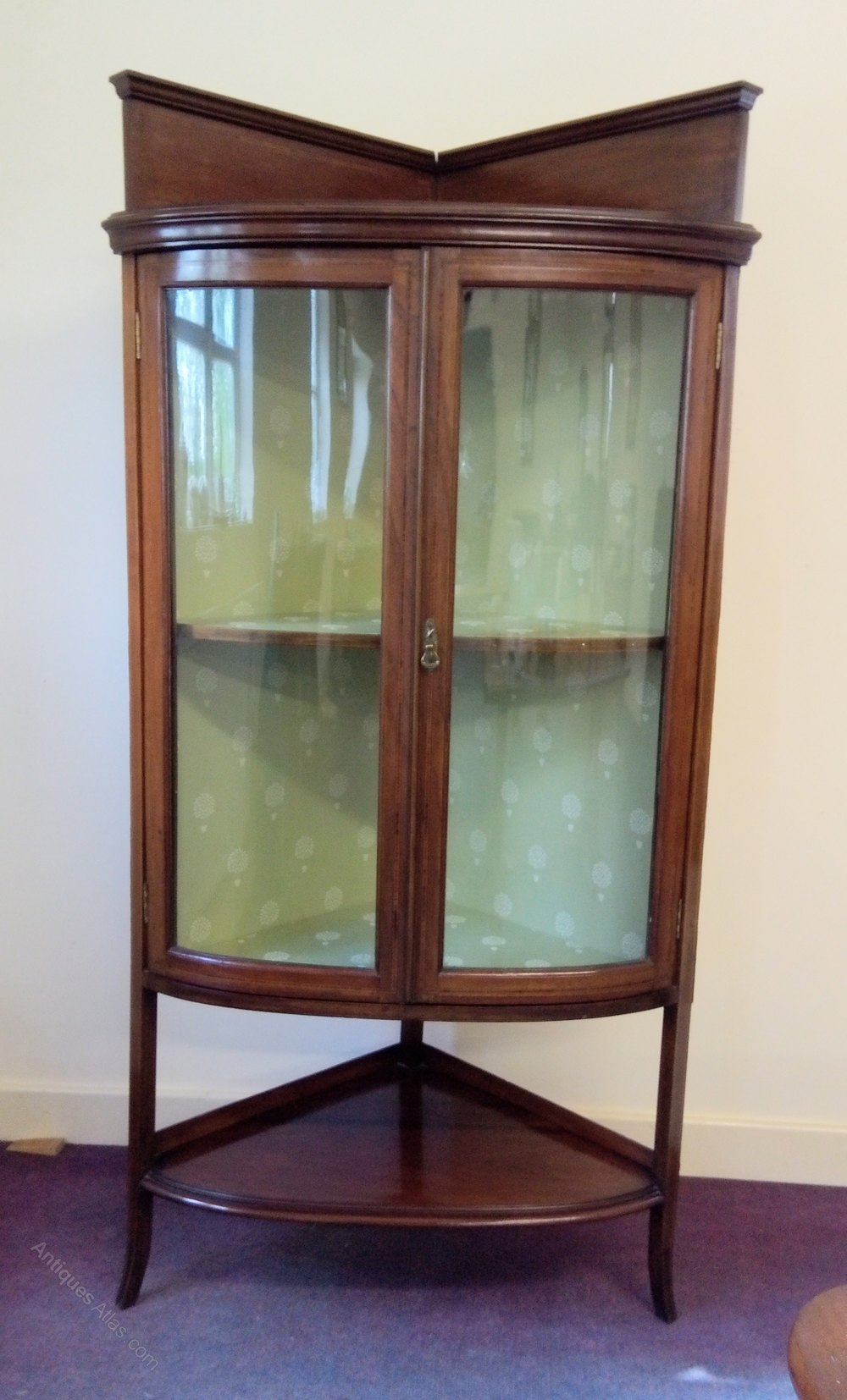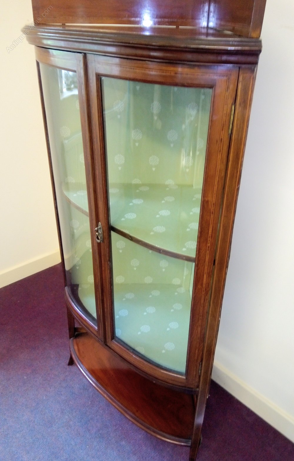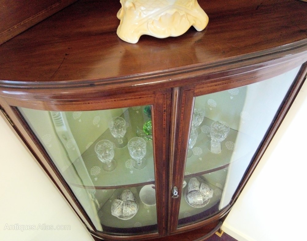 This inlaid mahogany corner display dates from circa 1900 and is in very nice and tidy original condition but with the interior relined so that is in excellent condition. The bow front being unusual in one of these and the doors boast a bow glass, a rather appealing part of this good looking cabinet. It is also a really useful item taking up little space but giving good storage and display space. It still has an operational lock and the key. ...... Sensibly priced it could fit well into most properties and into many rooms. Dont hesitate to give us a call to discuss 01565 874075