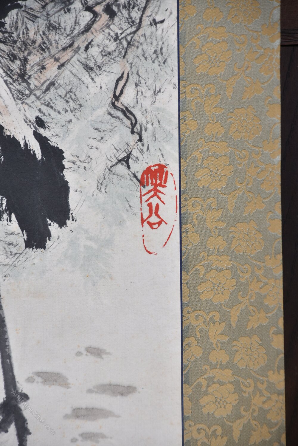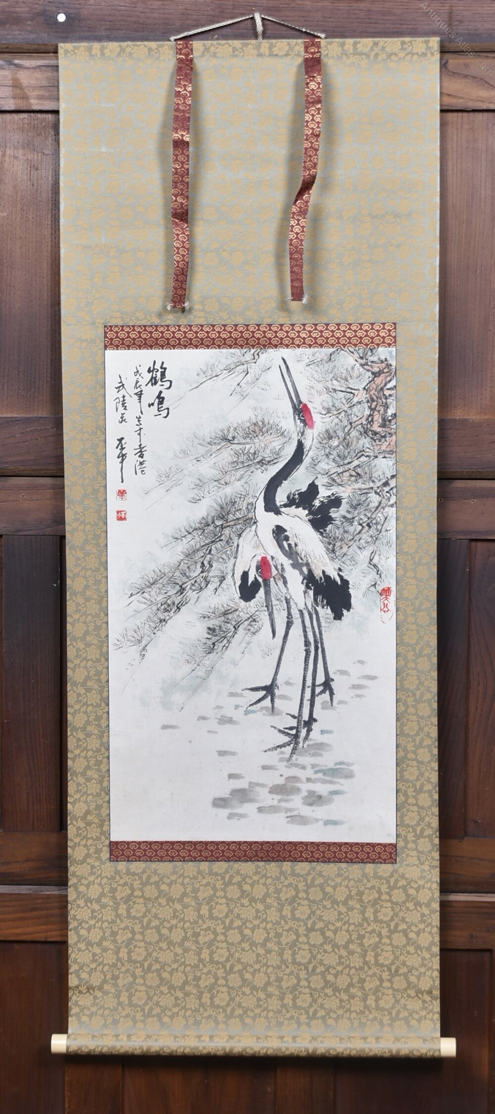 A beautifully composed Japanese hanging scroll depicting red‑crowned cranes among ancient pine — a classic motif symbolising longevity, steadfastness and auspicious fortune. A vertical inscription with the artist’s seal sits to the upper right, adding balance and authenticity. Mounted on richly patterned brocade in warm gold and russet tones and ready to hang. A storage case accompanies the piece.