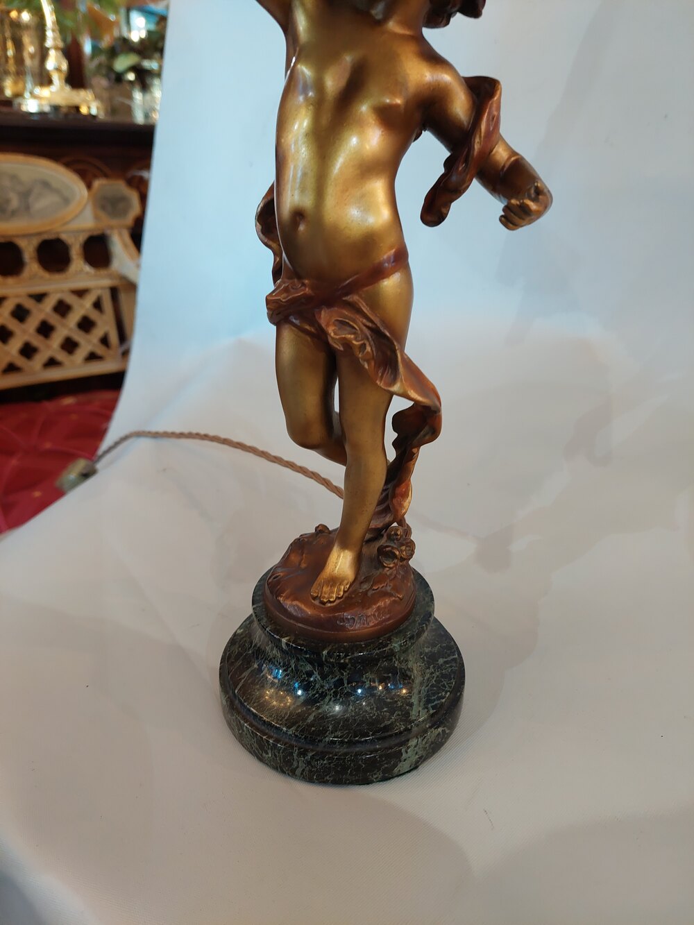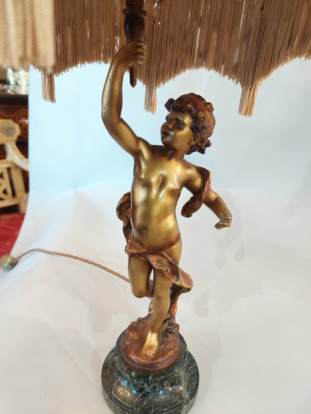 After Auguste Moreau Cold Painted Bronze Cherub converted to a table lamp on a marble base - signed - 12" diam x 24"h - The lampshade(s) are newly handmade silks by the same maker as provides the shades for Downton Abbey - all lights and lamps have been rewired with authentic corded flex, fitted with either foot switch or finger clicker switch and are Pat tested