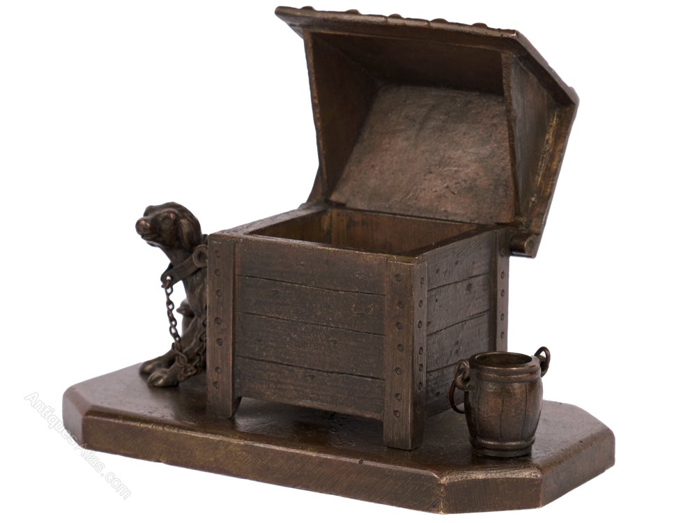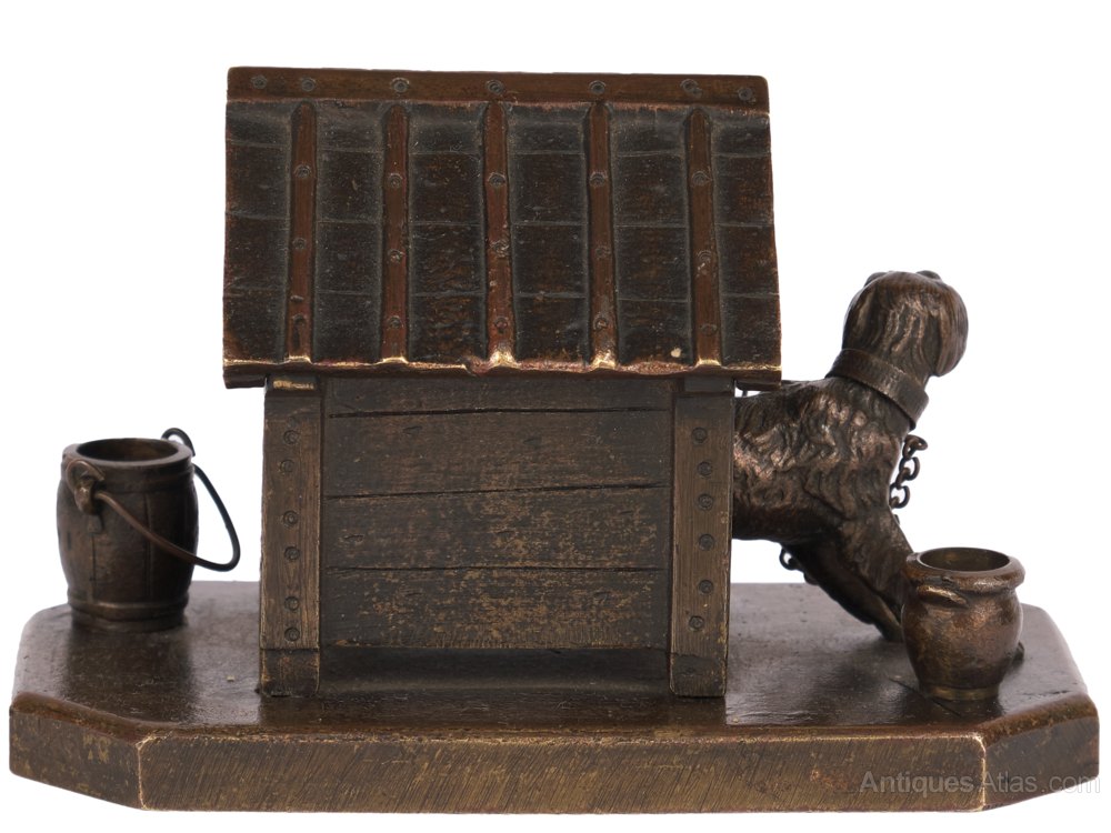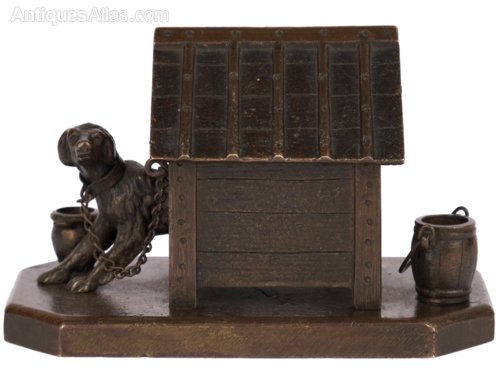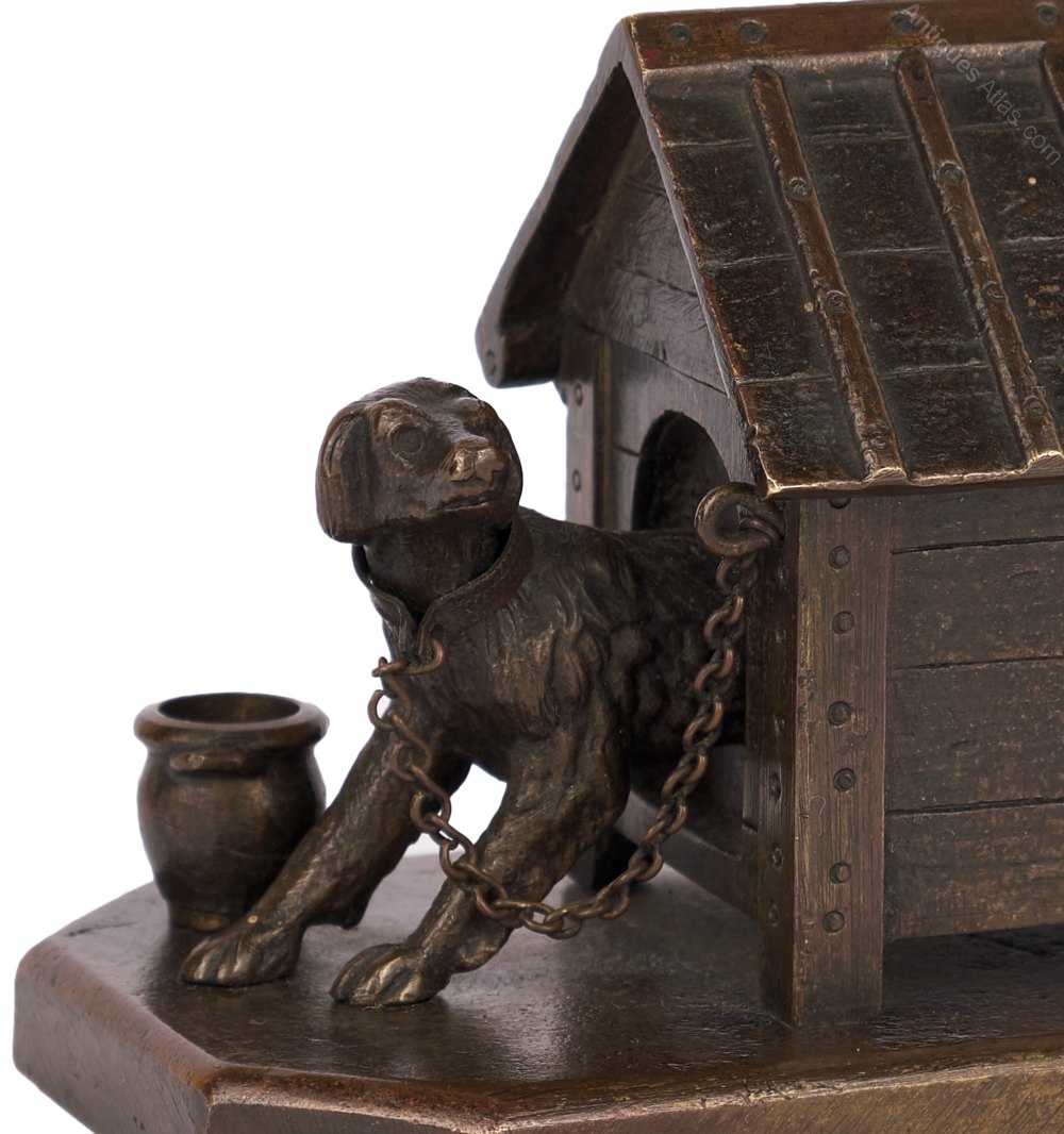 The kennel`s pitched roof is hinged, perhaps for use as a matchbox holder? Unsigned, the whole sitd on a plain octagonal base.