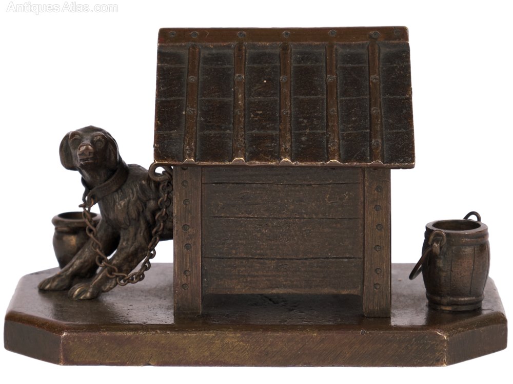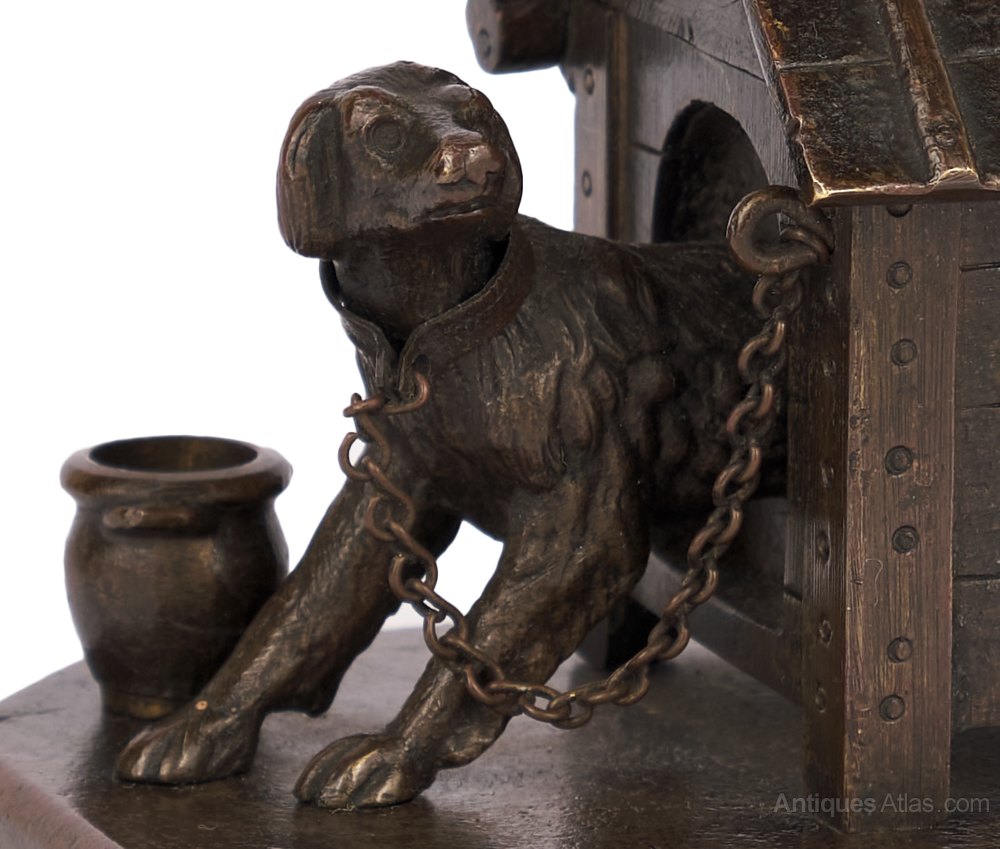 A late 19th century bronze depicting a dog emerging from its kennel, to which the dog is chained.