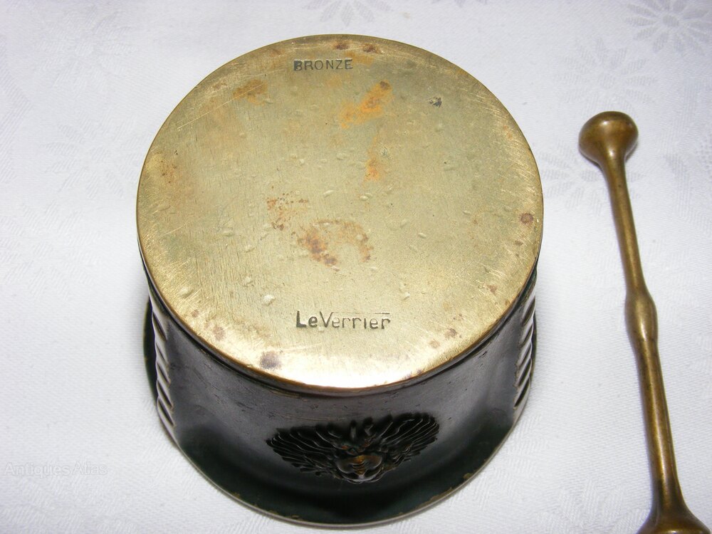 The underside of the mortar is clearly inscribed with "BRONZE" and the name "LeVerrier".