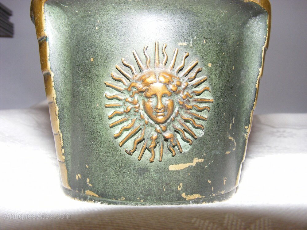 The exterior of the mortar is decorated with applied circular medallions, each depicting a radiating sun-like or stylized lion's head motif, flanking a central raised vertical band.