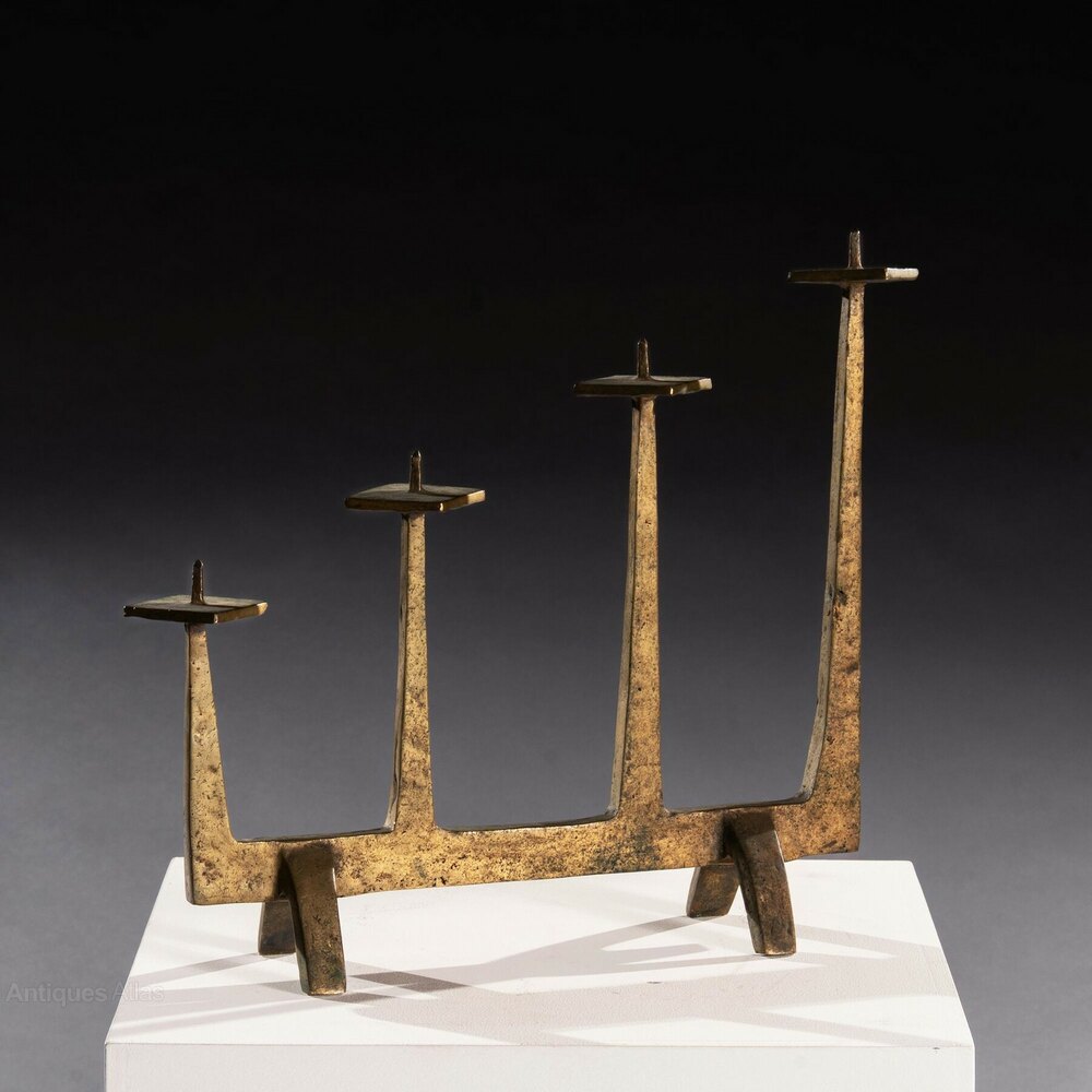 Conceived in the Brutalist style, this fine candelabrum for four candles of staggered heights is a lovely piece of 1960s design. Manufactured in hammered solid bronze which has attained a fine colour and patination, the four pricket candlestick platforms extend upwards from a flat base supported on four square legs. The bronze has been hammered out by hand and so has tooling marks which add great charm to the planished finish of the piece. The variation in colour across the piece is highly attractive. Making use of the pricket candlestick, a traditional form which was one of the earliest candlestick designs in use in Europe, the piece has simple lines and its modernist aesthetic, combined with the high quality construction and luxurious metal used, makes it a real statement piece.