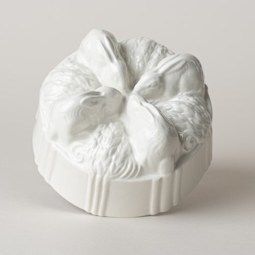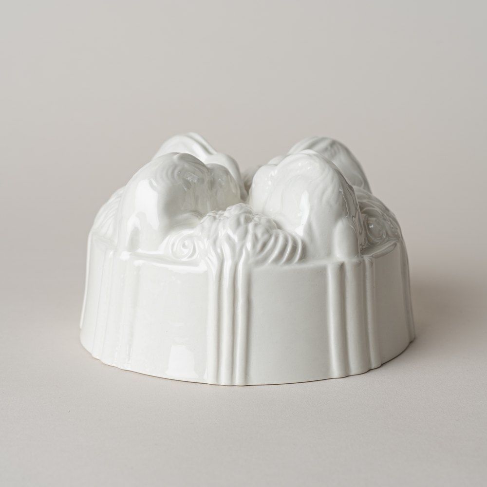 Traditional white ironstone jelly mould featuring four rabbits with fluted octagonal sides. Ideal for kids parties!
