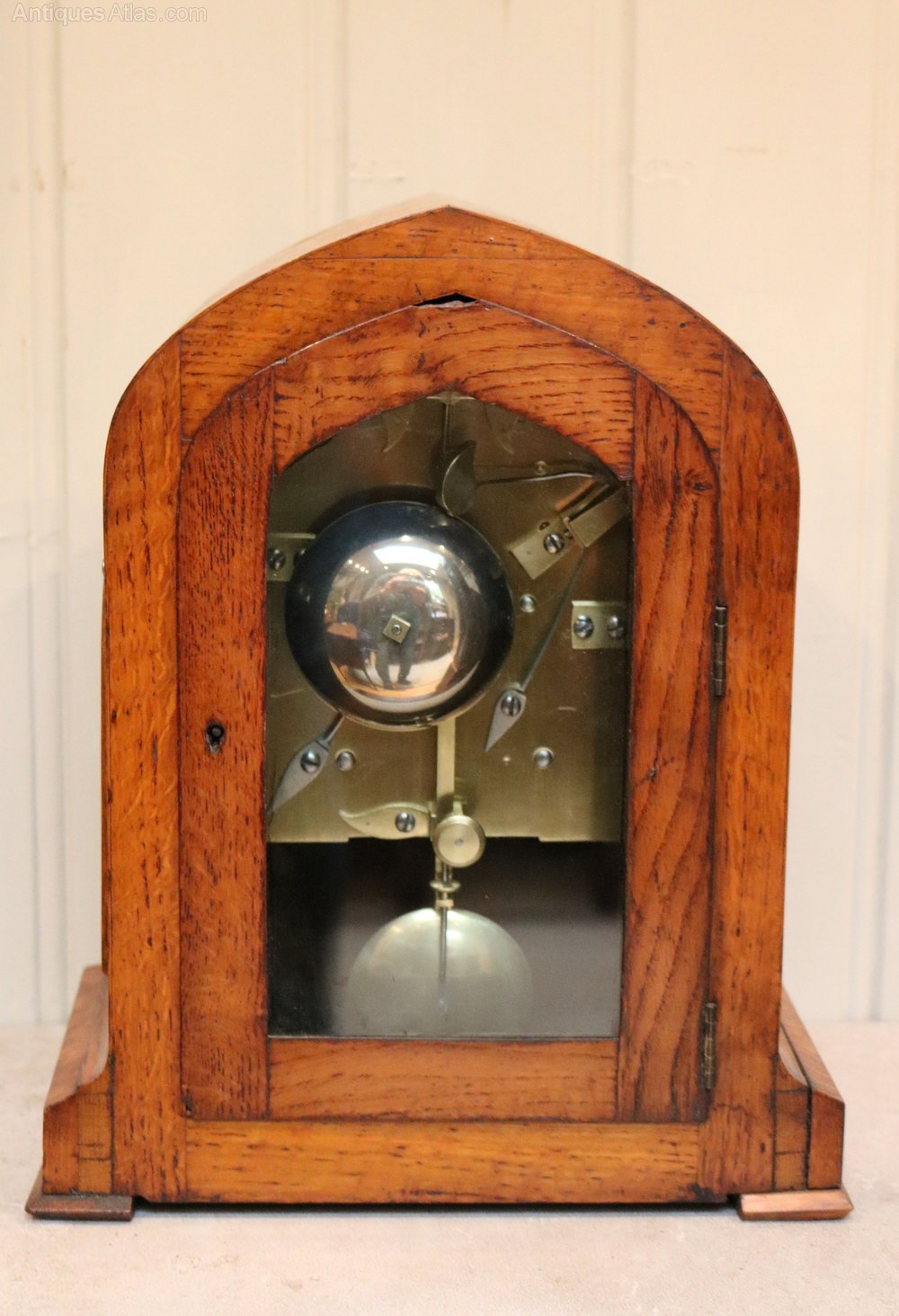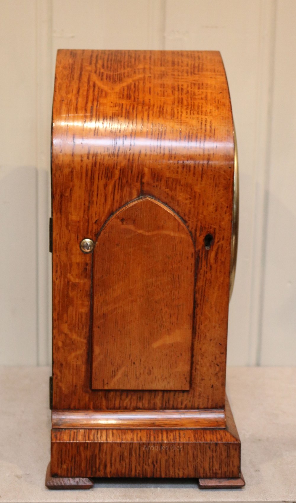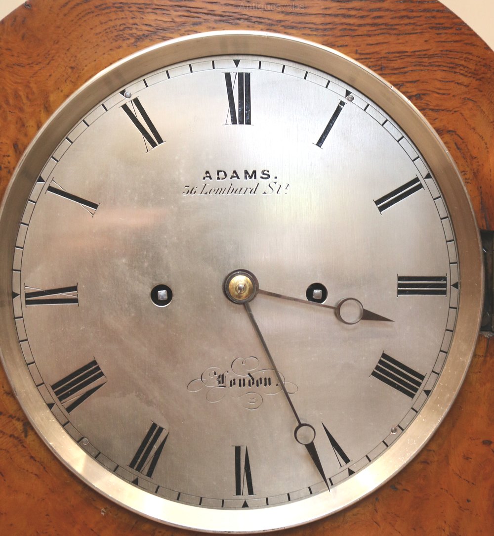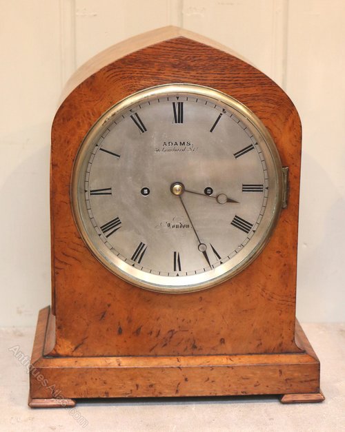 An imposing burr oak bracket antique clock dating to the first half of the 19th Century. It has a Gothic arch case, of simple form with a plinth base with chamfered corner plate feet. It has a 7 inch diameter silvered dial with a fine brass bezel and is engraved by the maker Adams of Lombard street, London. It has twin fusee movement that sounds the hours on a bell. Nathaniel Adams is listed as working in 1839
