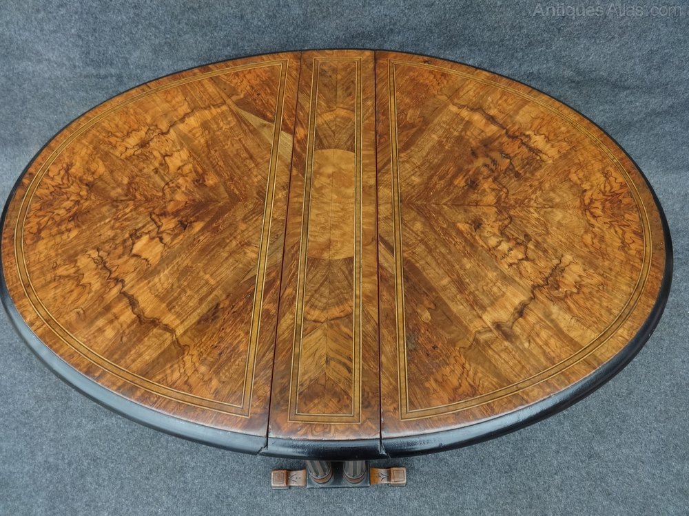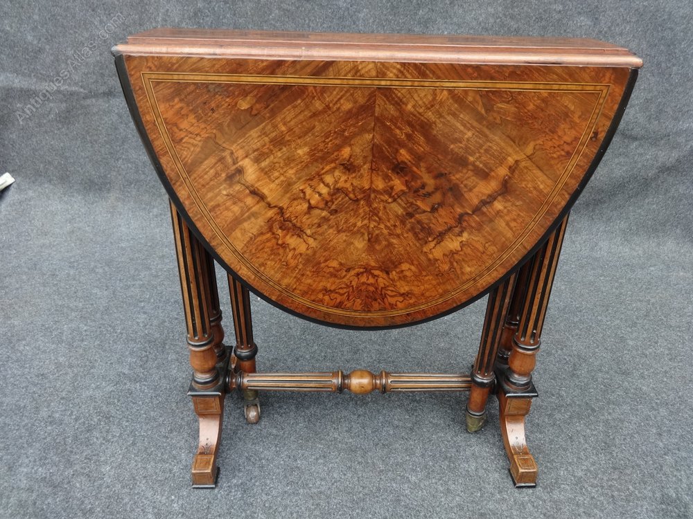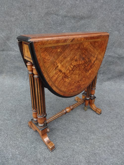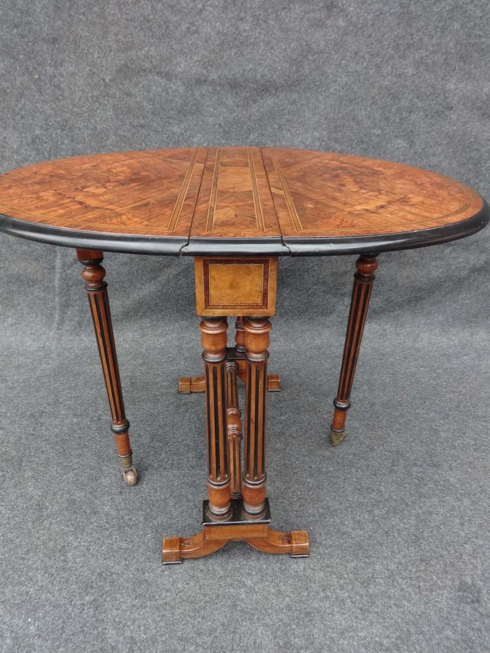 Very desirable burr walnut baby sutherland with ebony edge, walnut legs, inlaid with tulipwood, in very good condition.