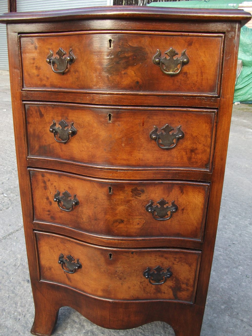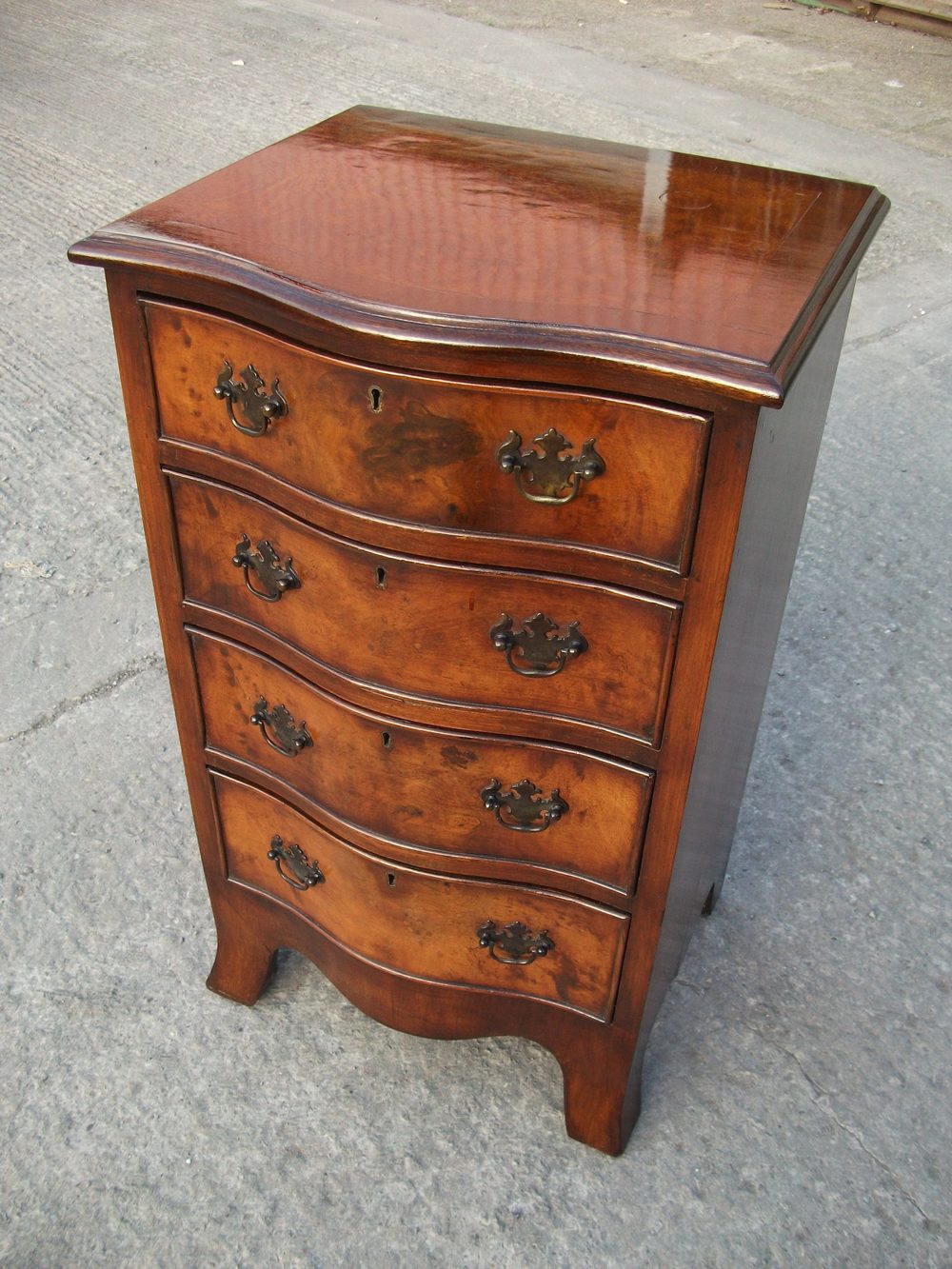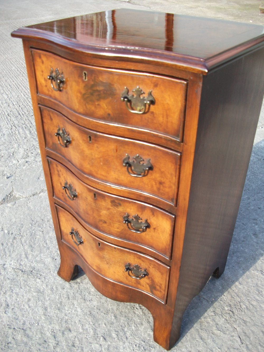 Very pretty burr walnut serpentine chest of 4 drawers, standing on outswept feet, with cockbeaded drawers, oak lined drawers and hand cut dovetails.
