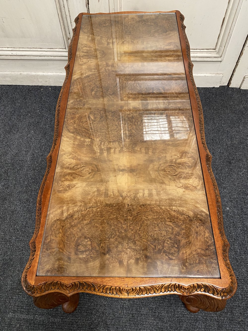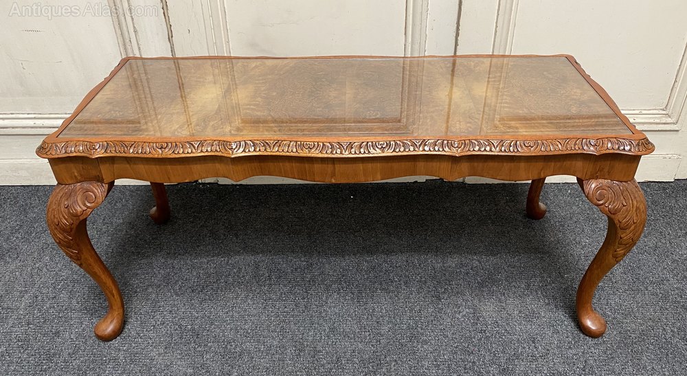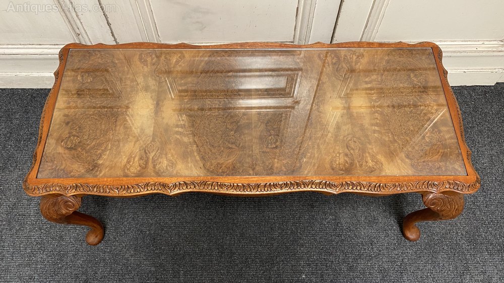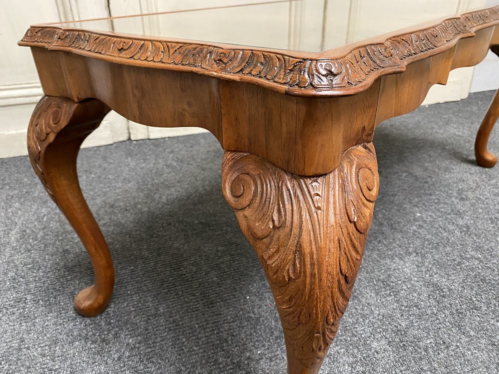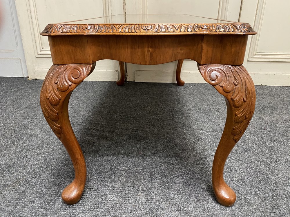 A lovely Burr Walnut Coffee Table, having inset glass protective top. The caring is crisp and she sits on elegant Queen Anne legs.
