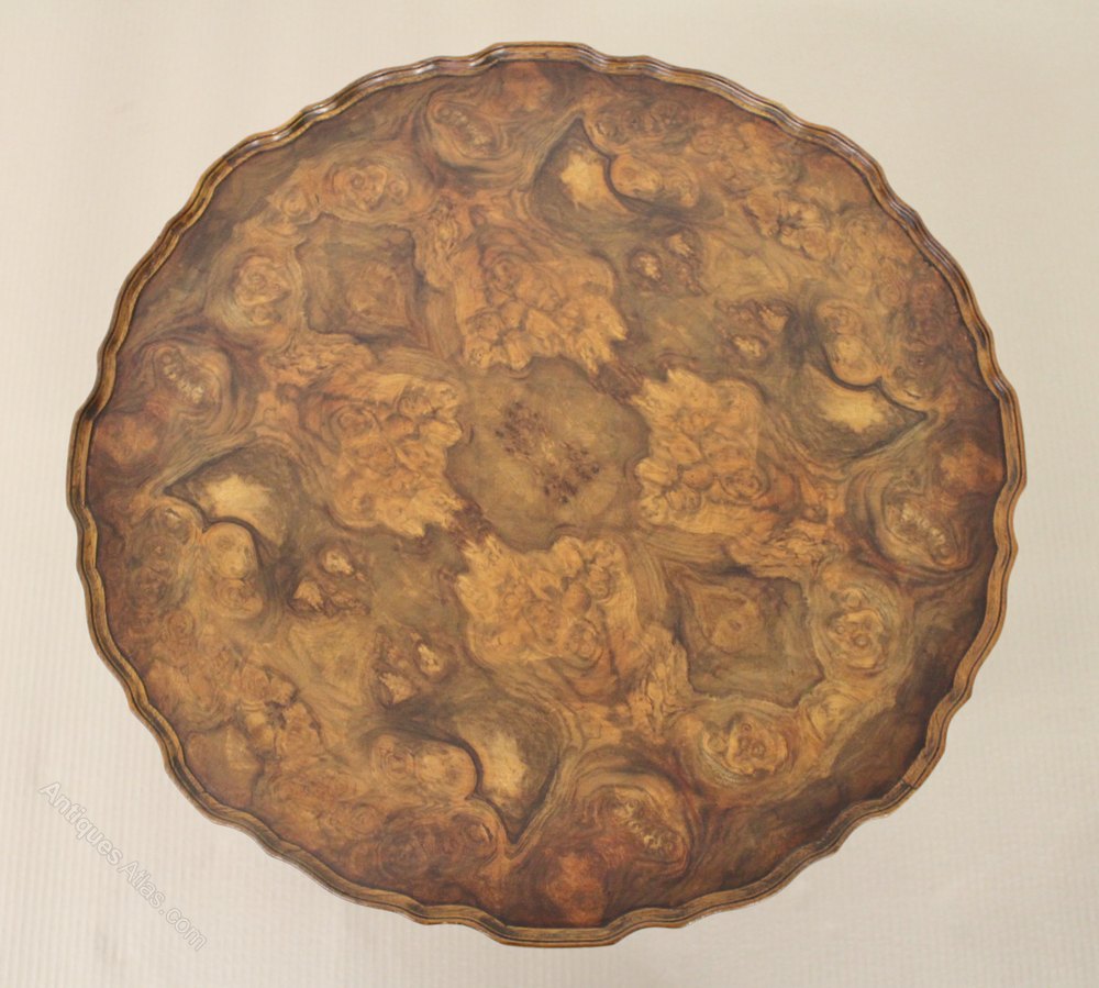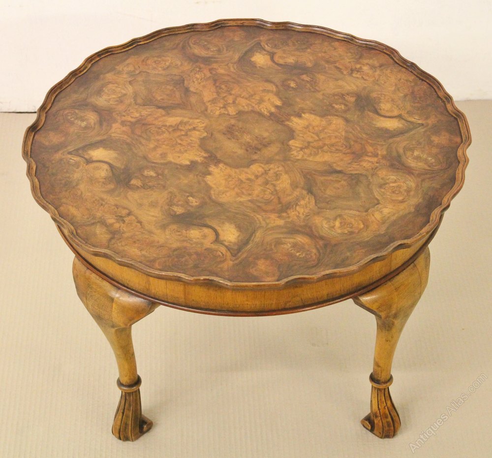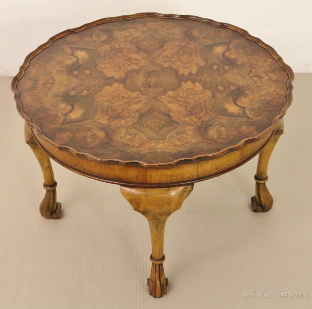 A lovely round coffee table in the Queen Anne style. Of good construction in solid walnut with stunning burr walnut veneers to the top. The round top is surrounded by a "pie-crust" shaped moulding. The cabriole legs terminate in stylish feet. We have had this coffee table sympathetically repolished to a very high standard , it has a lovely depth of colour. It is now offered for sale in excellent condition, ready to go straight into the home.