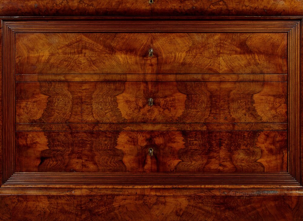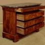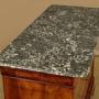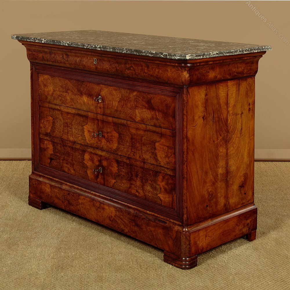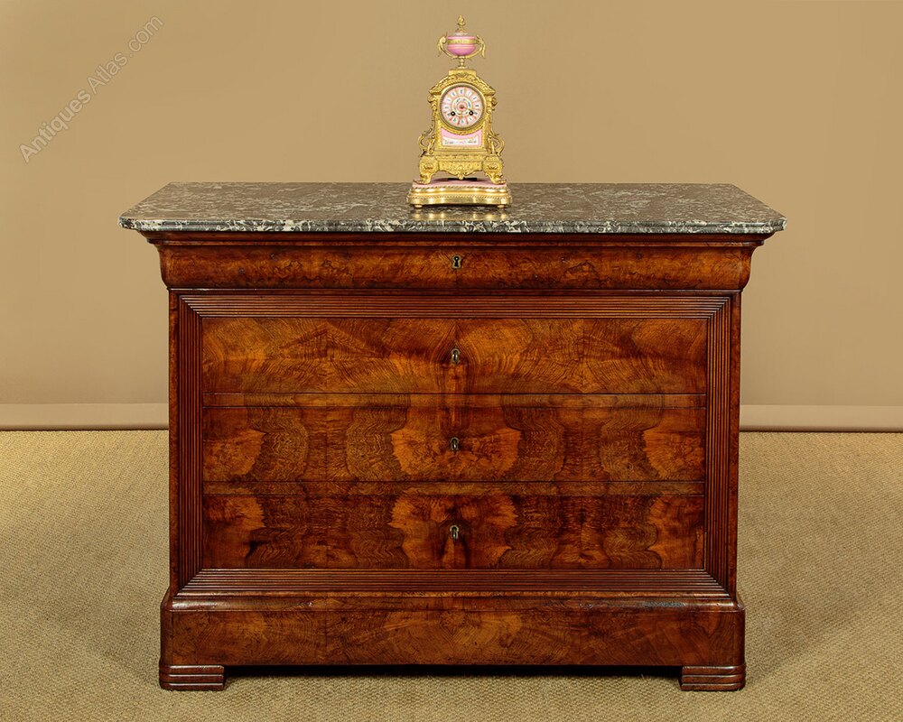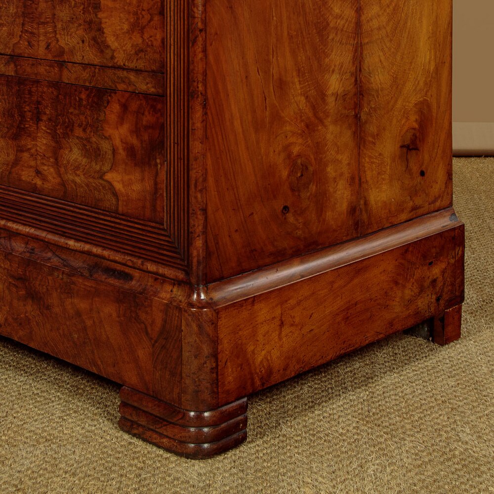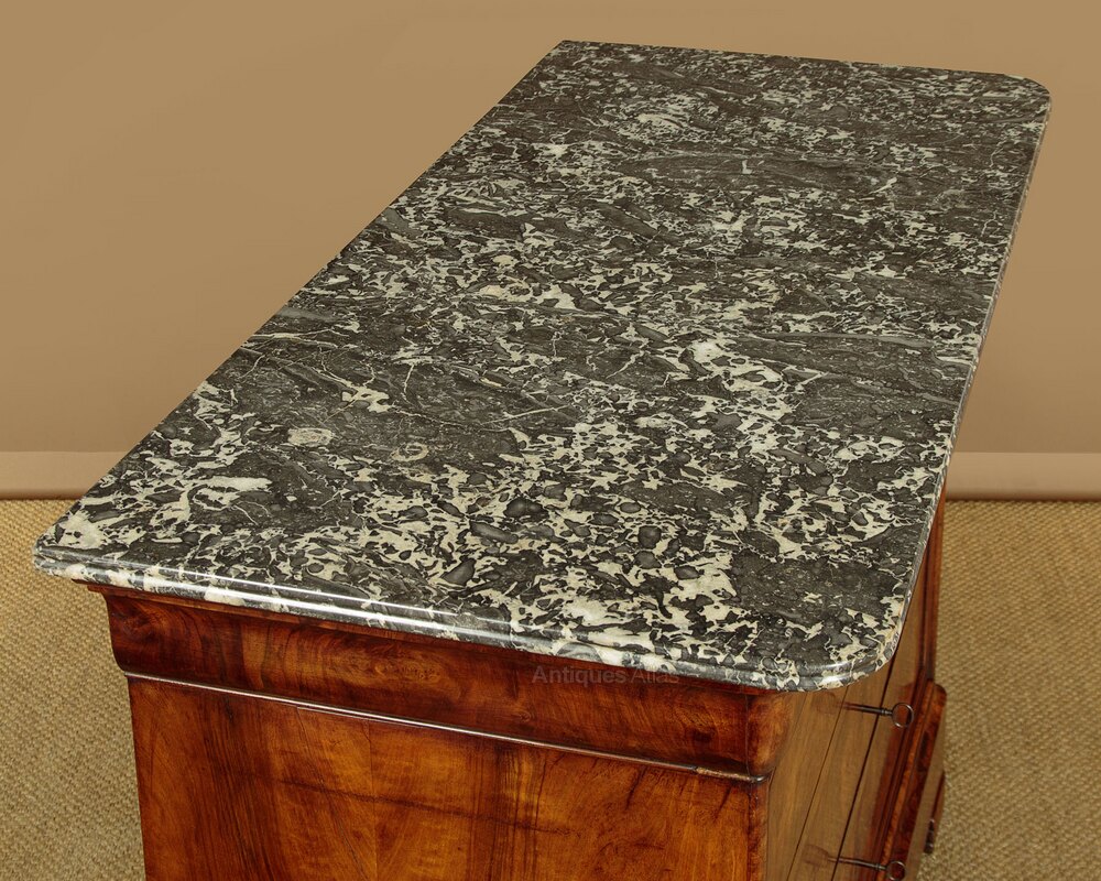 Superior quality French burr walnut and marble top chest of drawers or commode c.1860. Original and very well figured grey marble top rounded front corners and a moulded edge. Over a chest of four long drawers. Burr walnut veneers arranged in a striking symmetrical pattern across the front. Shallow top drawer with shaped front (continued on the sides of the cabinet), the three deeper drawers below within a reeded surround (an unusual feature). All four drawers with inlaid brass escutcheons. Moulded plinth veneered to match and raised on the original feet. Solid walnut sides and (unusually) drawer linings. Excellent colour and condition, cleaned and waxed in our workshops. Keys supplied.