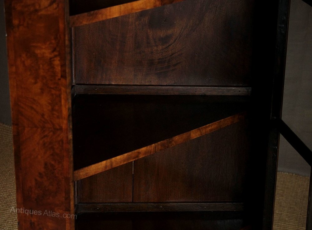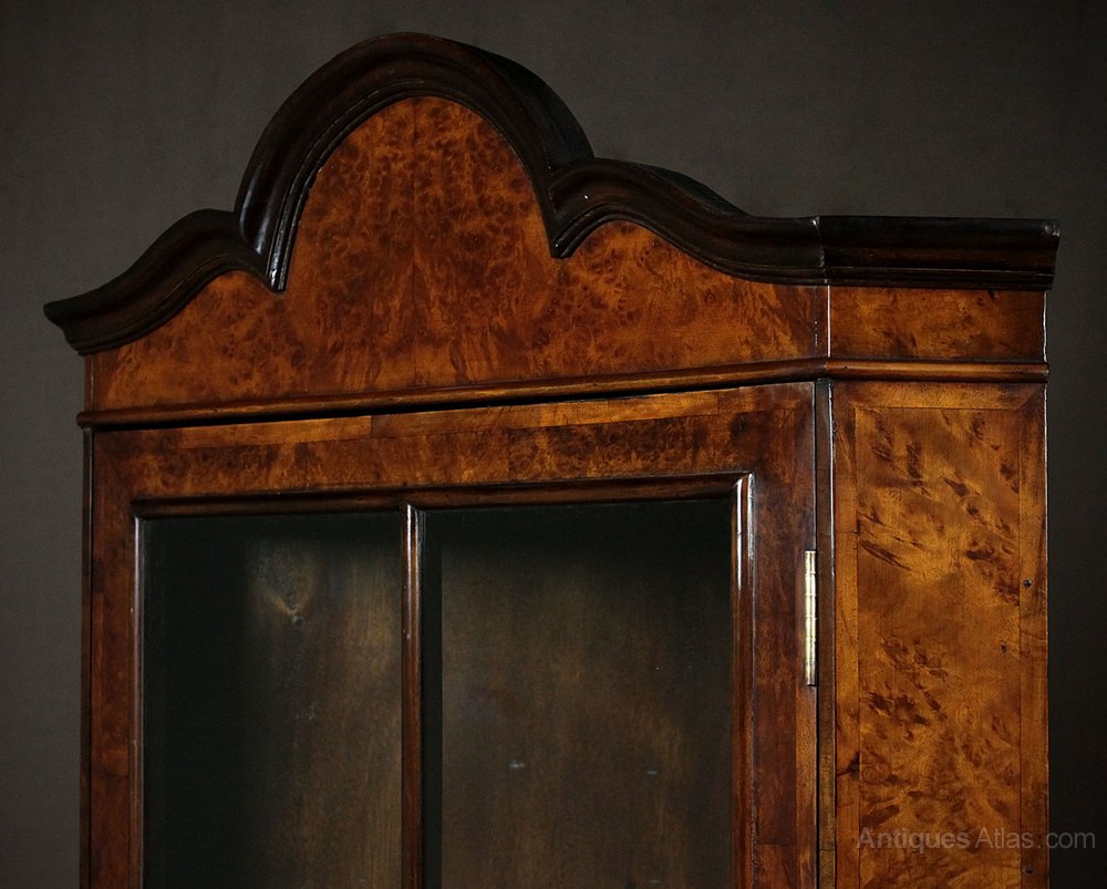 Smart early 20th.c. corner display cabinet c.1920. Shaped cornice and beautifully figured burr walnut veneers with crossbanded borders. Single door enclosing four shelves aligned with the glazing bars. Shaped apron at the base and solid mahogany backboards. Original label inside the door for William Spriggs & Co Ltd of Tottenham Court Rd, London. Excellent colour and condition, cleaned and polished in our workshops. Key supplied.