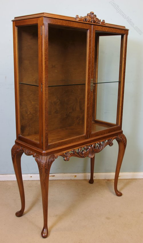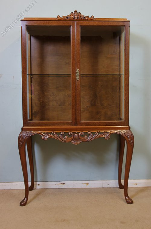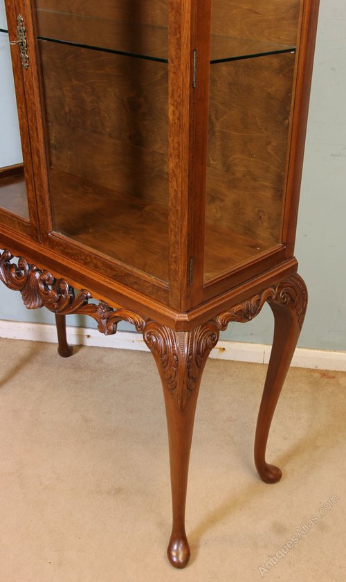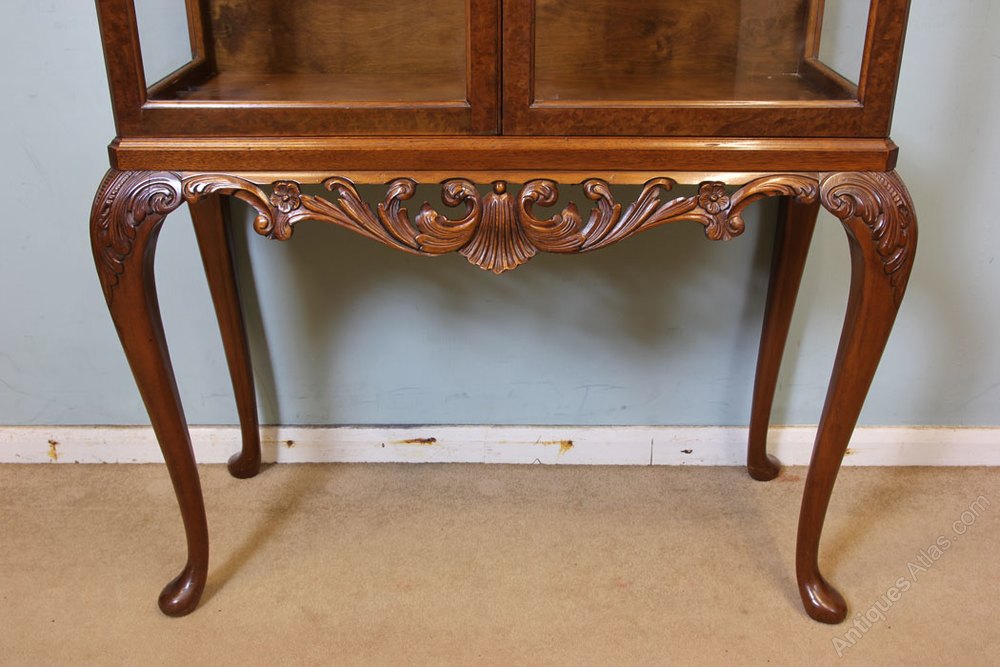 Antique Queen Anne Style Burr Walnut Display Cabinet, This Queen Anne style burr walnut display cabinet dates to the Mid 20th century. The moulded top has a decorative carving to the centre with two glazed doors under. Having carved skirt under and all supported by Cabriole carved legs.