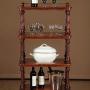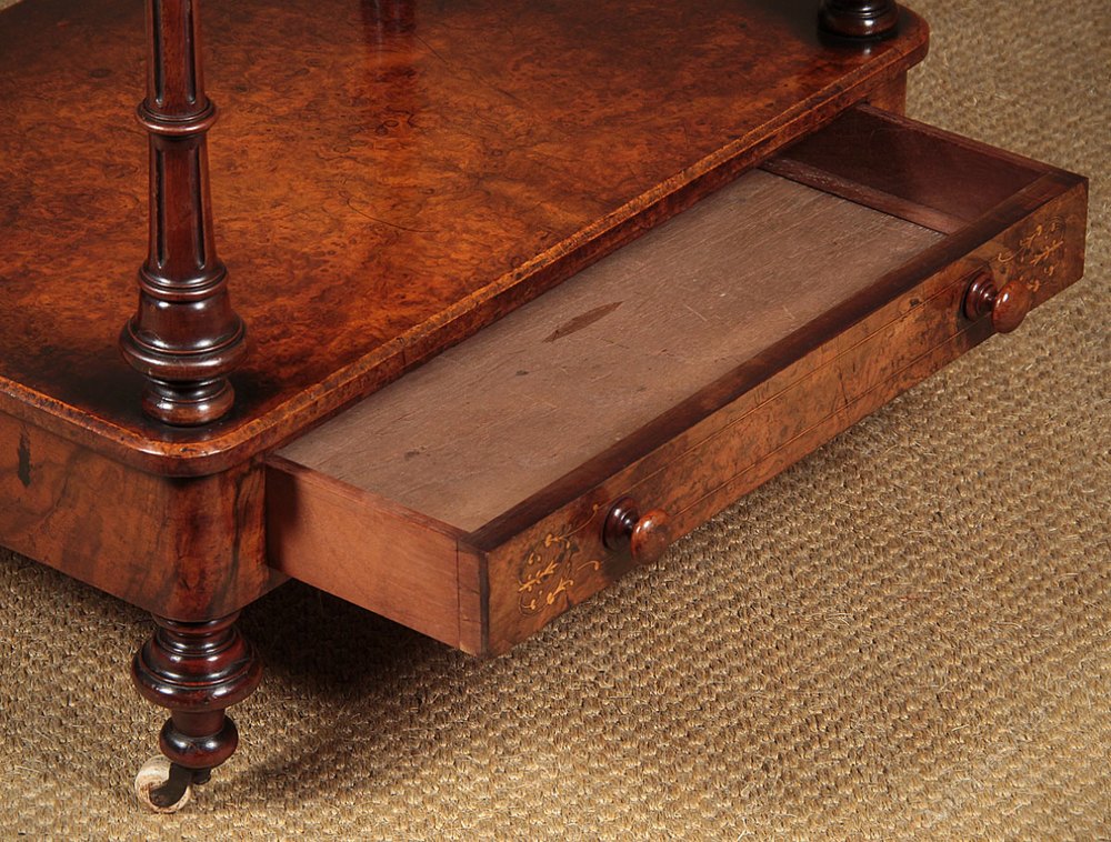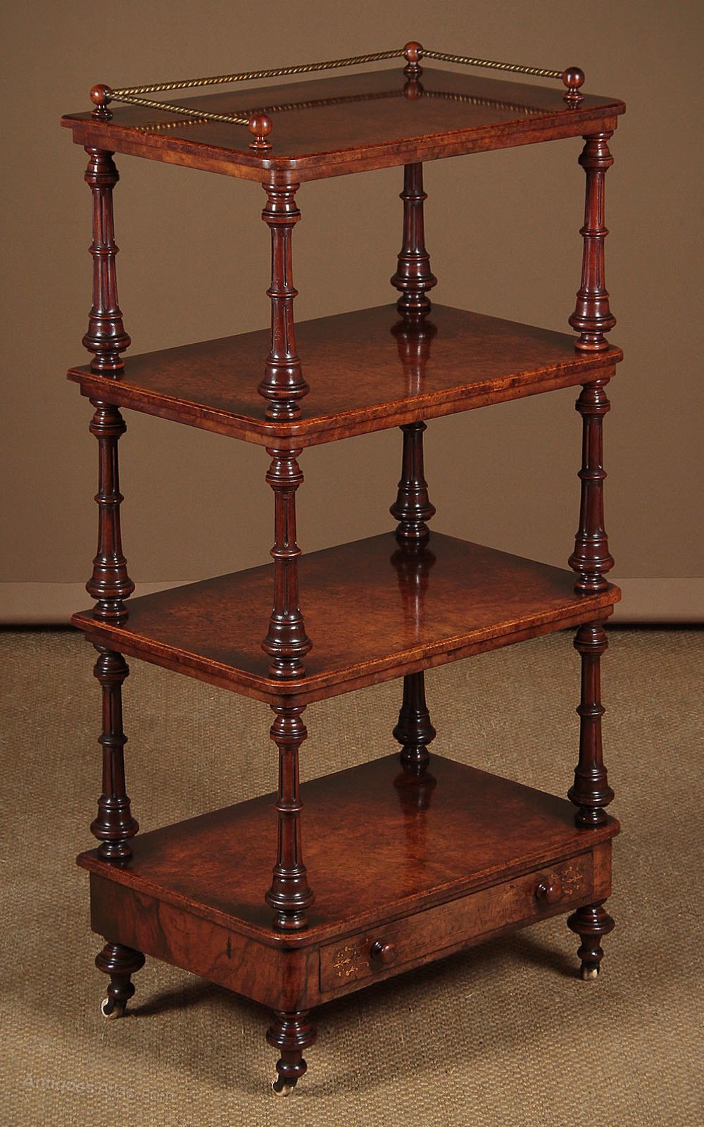 Fine quality late 19th.c. burr walnut four tier dumb waiter c.1870. Four 24″ x 16″ shelves with a twisted brass rail to the sides and rear of the top shelf, plus useful little drawer in base. Beautifully figured burr walnut veneers to the shelves and base, with inlaid detail to the drawer front. Crisp turned and fluted column supports in solid walnut and turned feet raised on the original white ceramic castors. Mahogany groundwork and drawer linings. Excellent colour and condition, cleaned and waxed in our workshops.