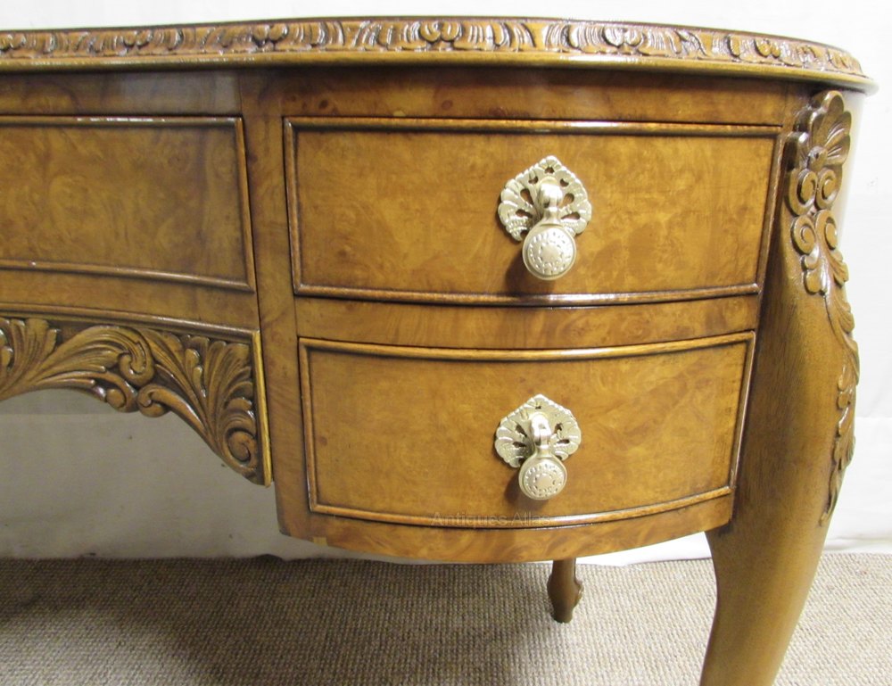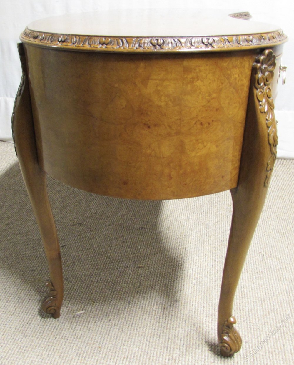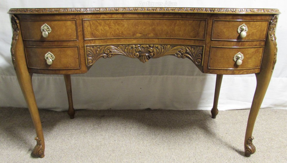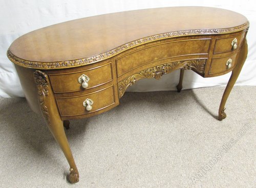 A superb quality Dressing Table, Kidney in shape and having 5 drawers which run smoothly and fitted with original brass handles. The piece is made from Walnut with excellent tight burr walnut to the top and right round. The carved decoration is crisp and well executed. She sits on Queen Anne legs with carved feet.
