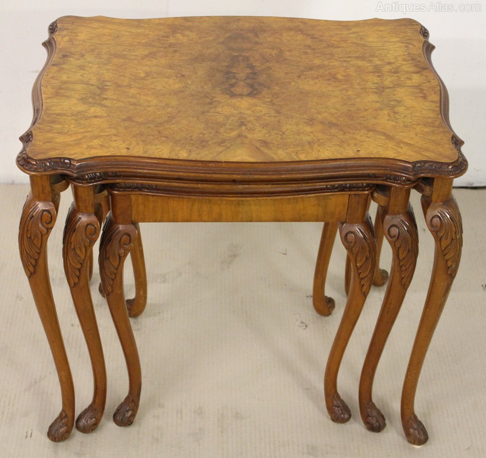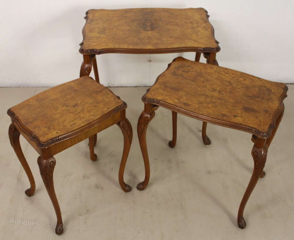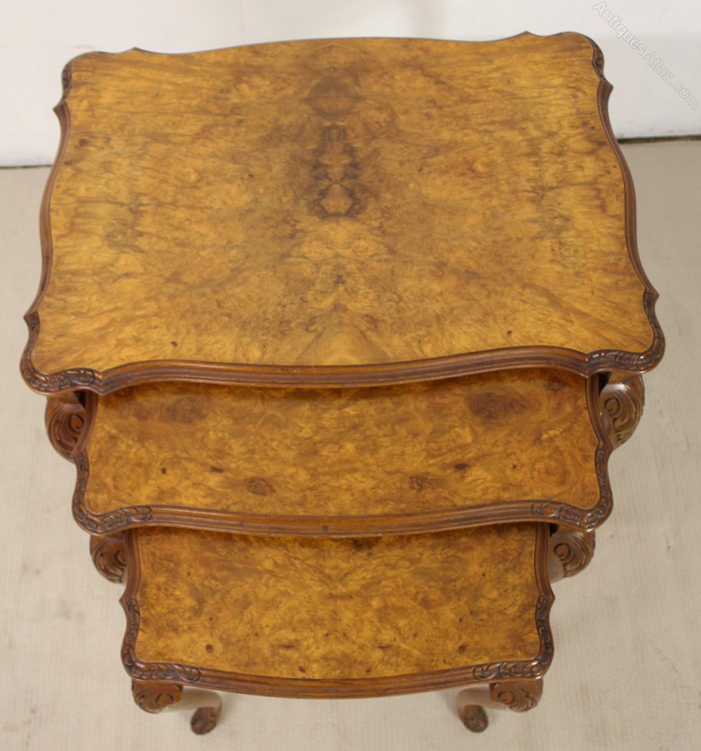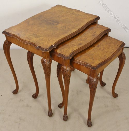 A lovely nest of 3 antique tables in the Queen Anne style. Well made from solid walnut with attractive burr walnut veneers to the tops. The shaped tops are decorated with carved detailing to the edges. Further carved decoration is found to the knees of the elegant cabriole legs. This attractive and practical nest of tables is offered for sale in excellent original condition, with a great colour and free from all wobbles.