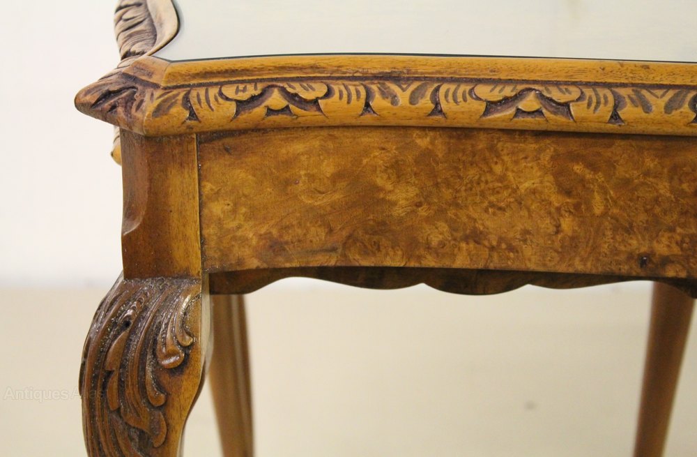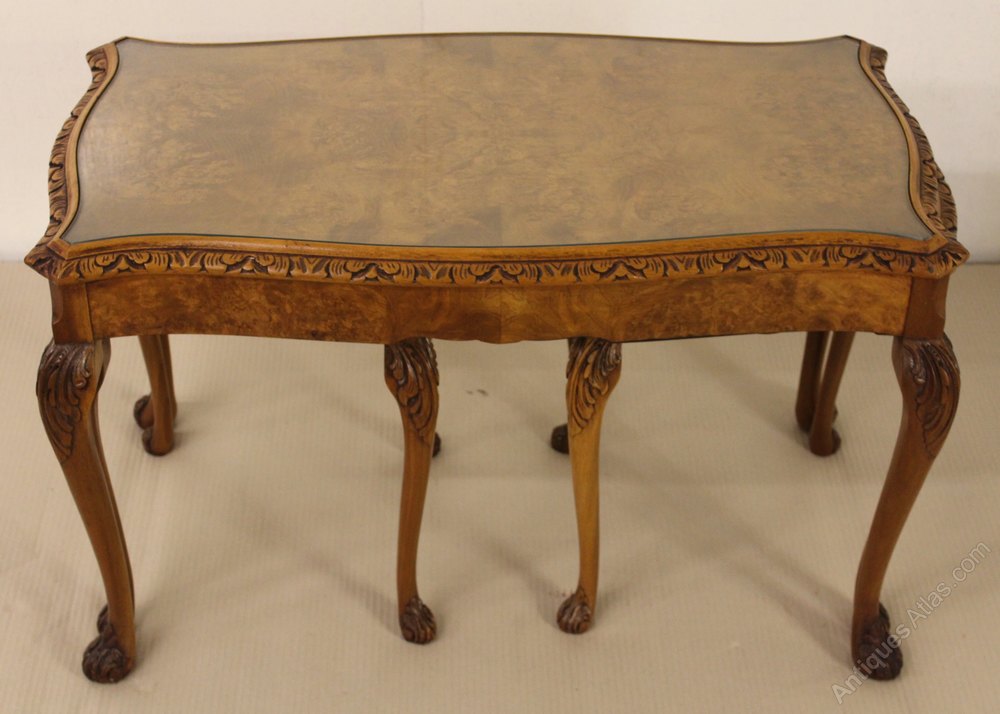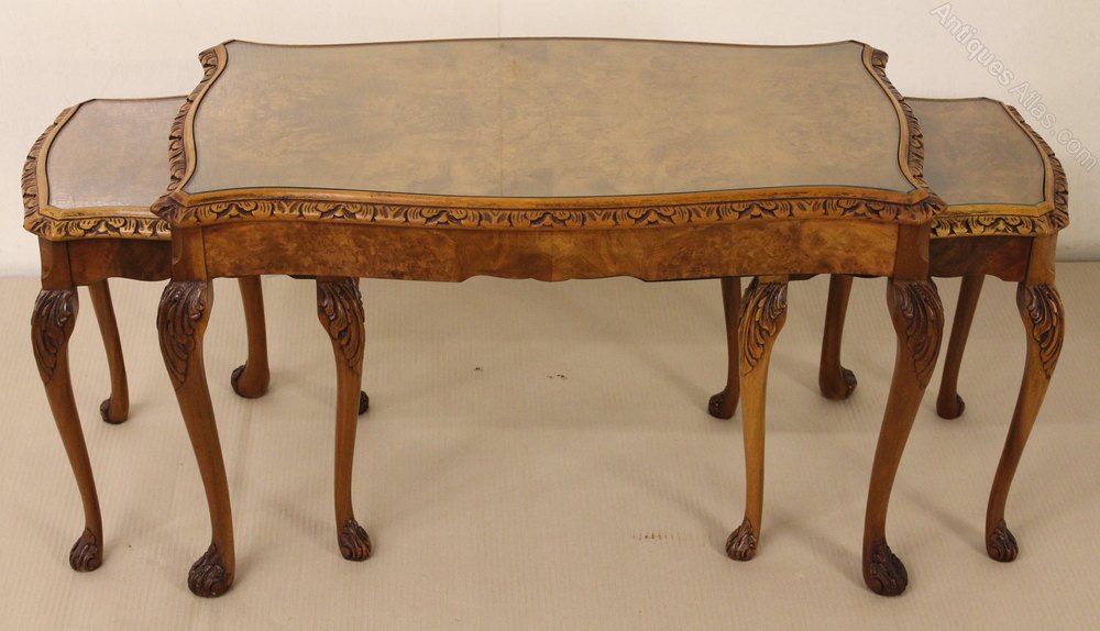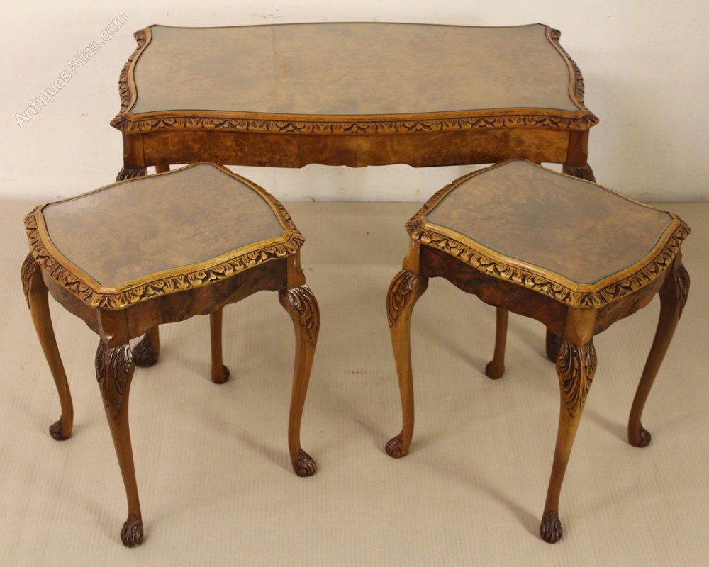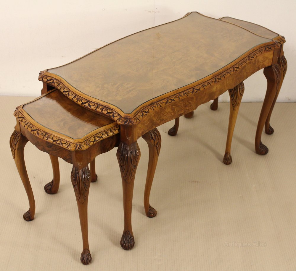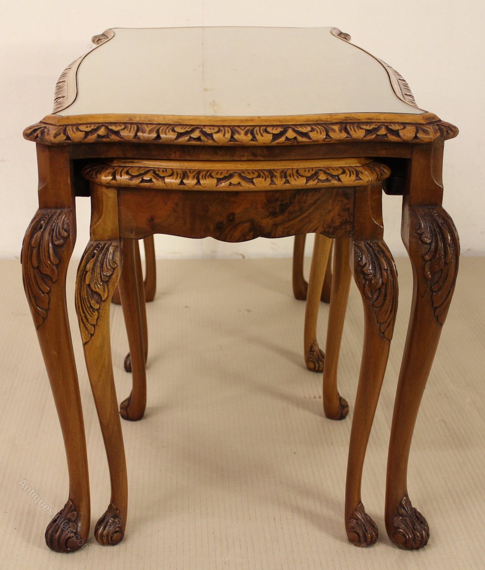 A very good "long John" nest of 3 burr walnut antique tables in the Queen Anne style. Of good construction in walnut with attractive burr walnut veneers. The serpentine shaped tops have removable inset glass tops and have carved decorations to the surrounds. The lovely cabriole legs have further carved detailing to the knees and feet. We have had this nest of tables sympathetically repolished to a very high standard. They are in excellent condition with a great colour and patina and are sturdy, being free from all wobbles.