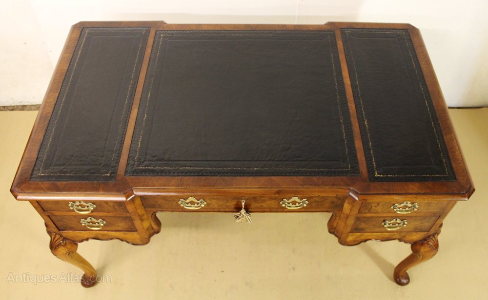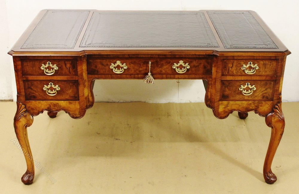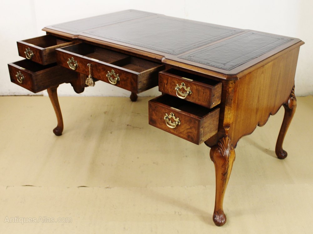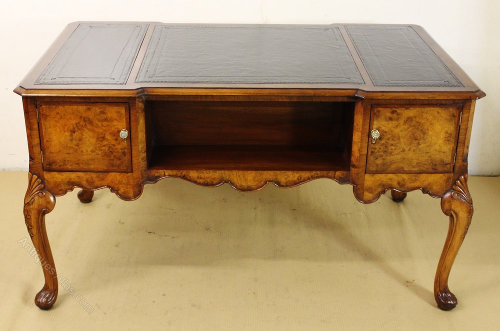 Antique Burr Walnut Leather Top Pedestal Desk