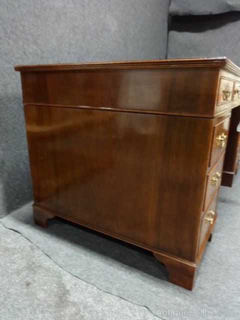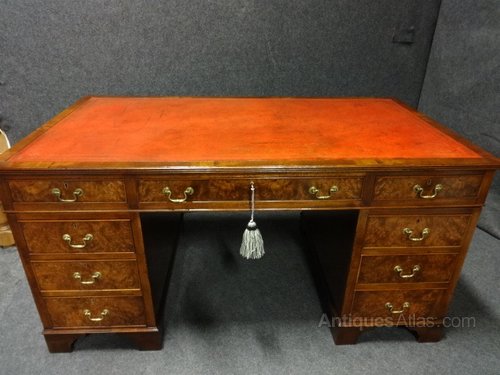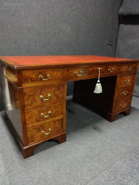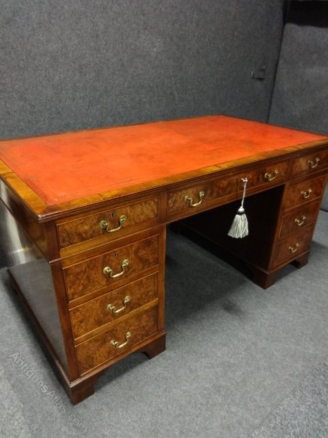 A good nine drawer pedestal desk with burr walnut drawer fronts, brass swan necked handles and red leather top. In very good condition.