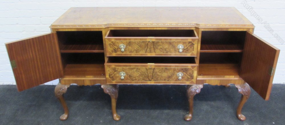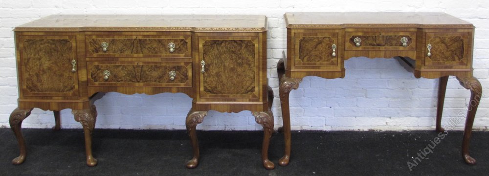 A truly wonderful complete dining suite. Made from walnut with excellent tight Burr Walnut. Comprises Dining Table, Set 6 Chairs (2 Arms), Sideboard and Server.