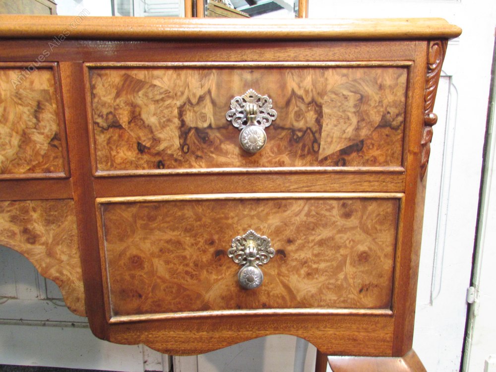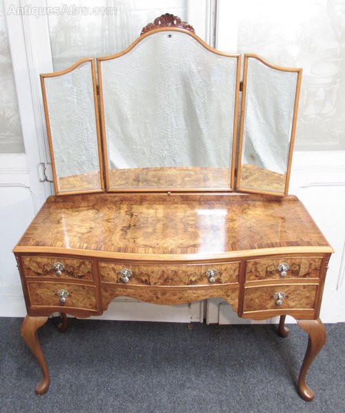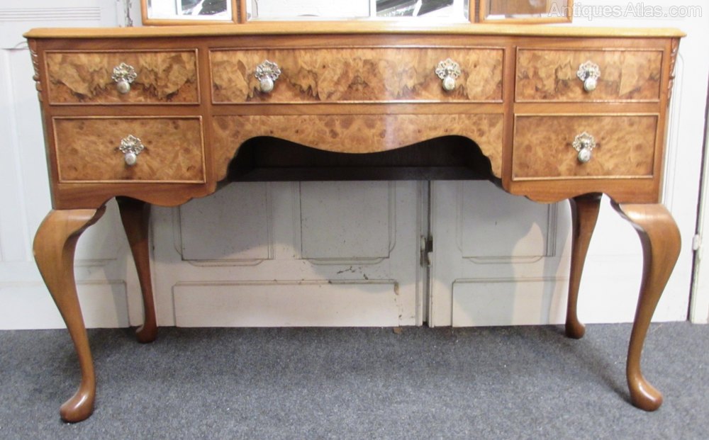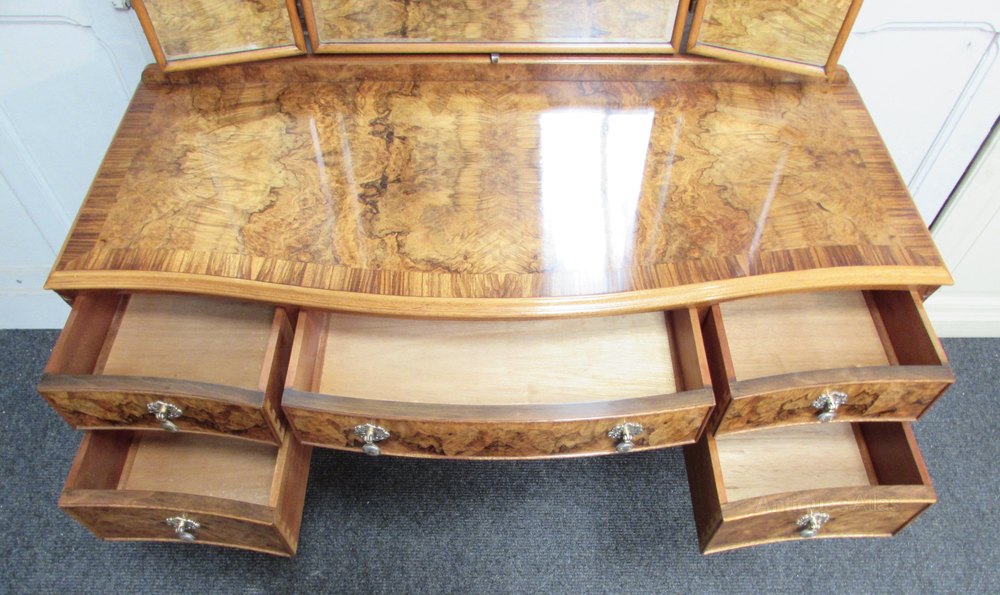 A superb quality Dressing Table, made from Walnut with exquisite Burrs to the top and front. She is serpentine in form having 3 bevelled mirrors that all move independently, the central mirror has a rake adjustment. All the drawers run smoothly and fitted with original handles. She sits on Queen Anne legs.