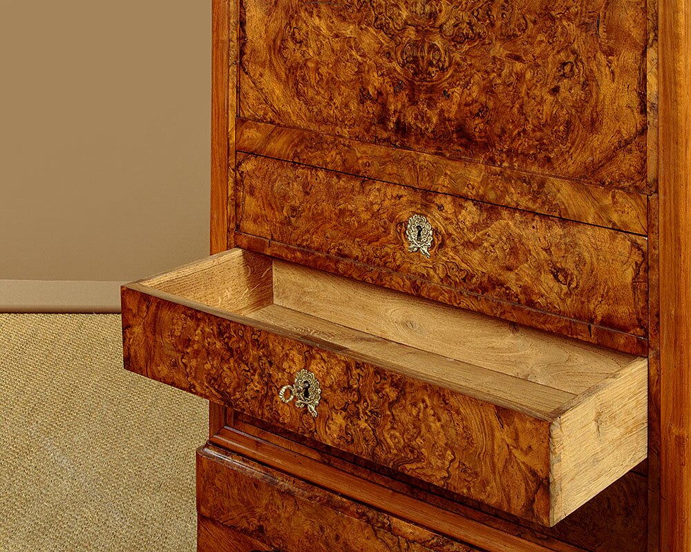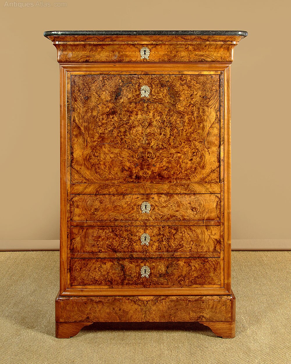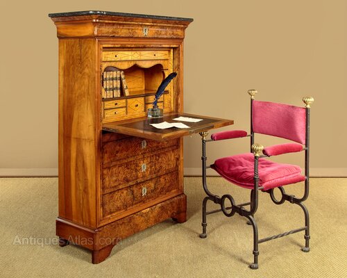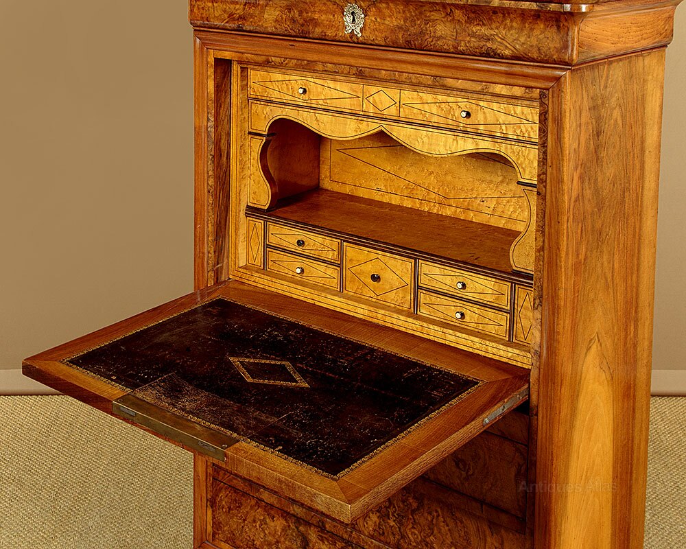 Superb mid 19th.c. French secretaire abattant or writing bureau in burr walnut c.1840. Open the fall to form a good sized desk (height 32") with a gilt tooled writing surface. Beautiful fitted interior in sparkling maple veneers with ebony inlaid stringing featuring a long drawer and open bookshelf over five small drawers plus two secret compartments opening with hidden sprung catches. Original grey marble top, a frieze drawer above the bureau and three more drawers below. Highly figured burr veneers arranged in a symmetrical pattern across the fall and drawer fronts with decorative brass escutcheons. Walnut veneered sides. Raised on a moulded plinth and shaped bracket feet, also veneered to match. Oak drawer linings. Remove the top drawer to reveal two unusual handwritten inscriptions dated 1846 and (Strasbourg) 1847. Excellent condition, cleaned and waxed in our workshops. Note the original locks, keys supplied.