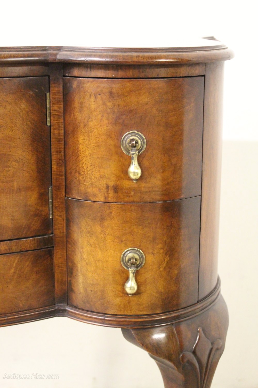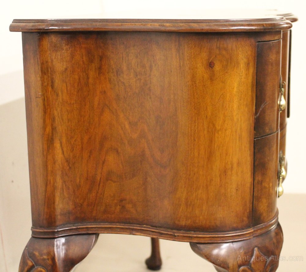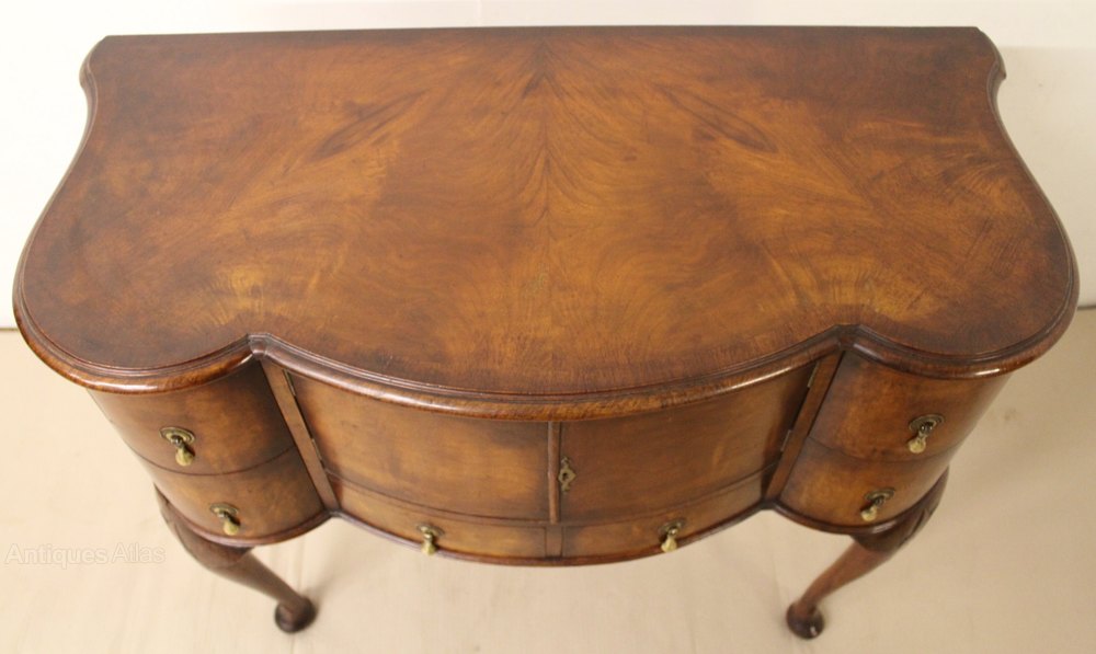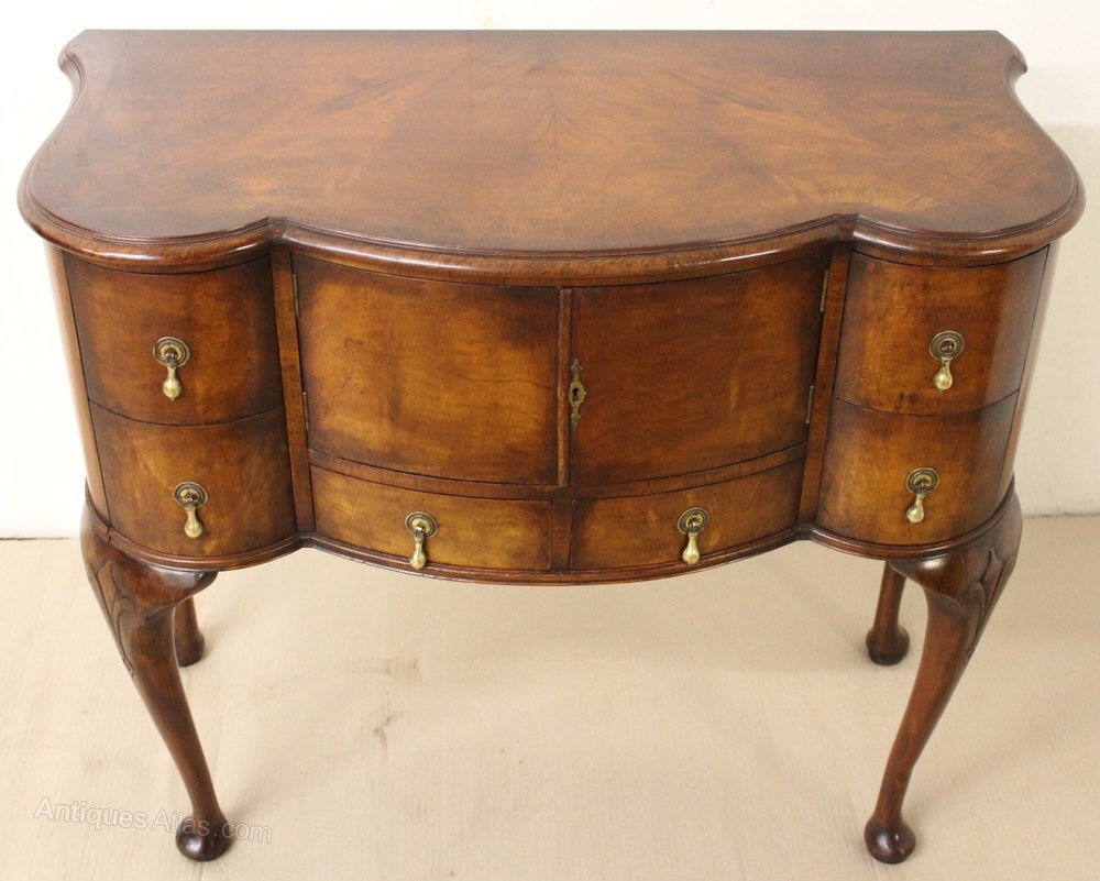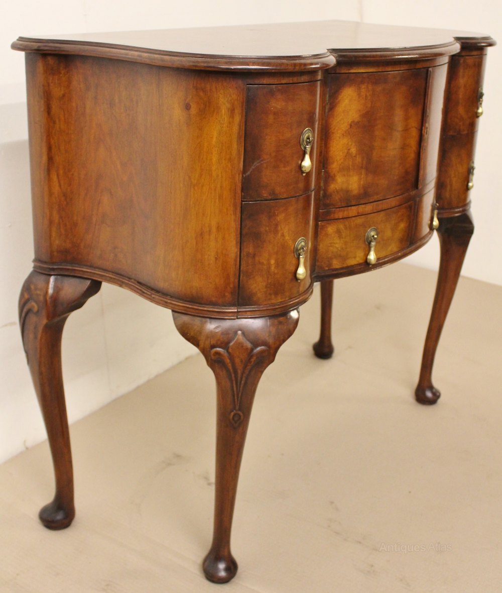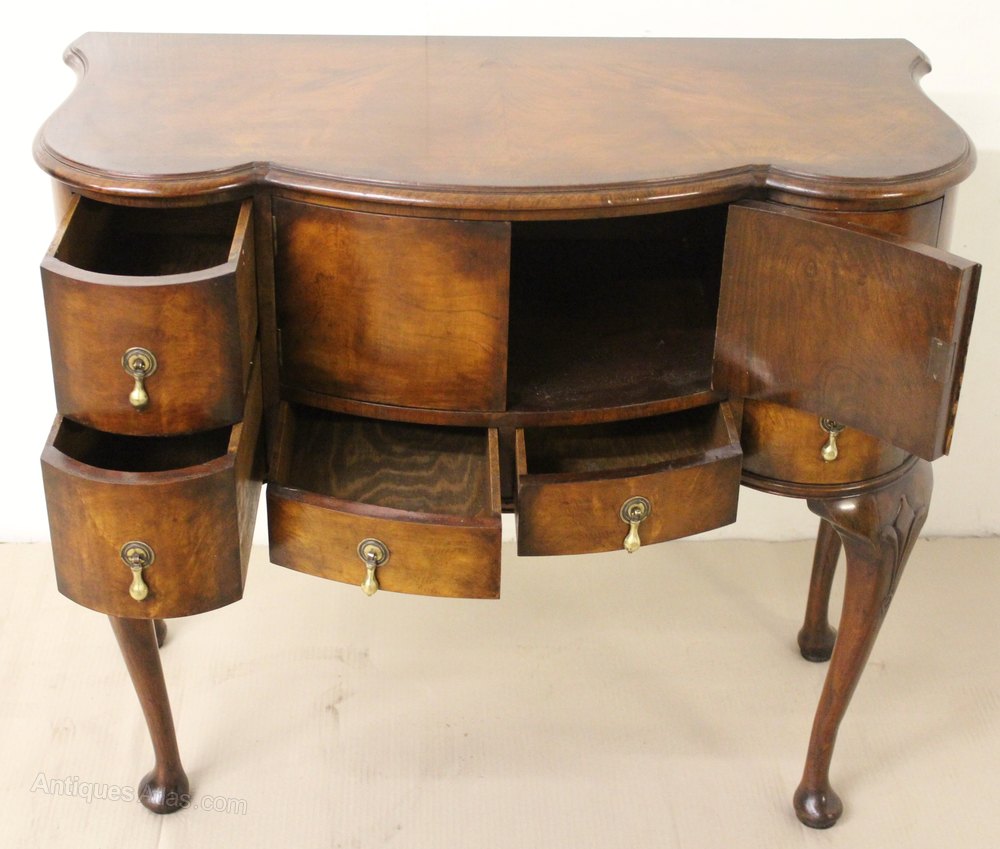 A lovely burr walnut side cabinet , or cupboard, in the Queen Anne style. Of good construction in solid walnut with attractive burr walnut veneers. It is of serpentine form , with shape to the front and also the sides. The serpentine shaped top is cross banded and sits over an arrangement of drawers and a central cupboard. All of thr original brass hardware id in place. This versatile piece of antique furniture could function in a range of different room settings, ie side table, hall table, lamp table etc. It has a great colour and patina and is offered for sale in excellent condition, ready to go straight into the home.