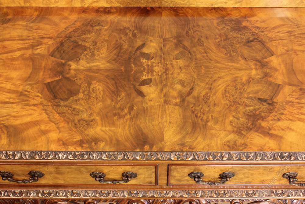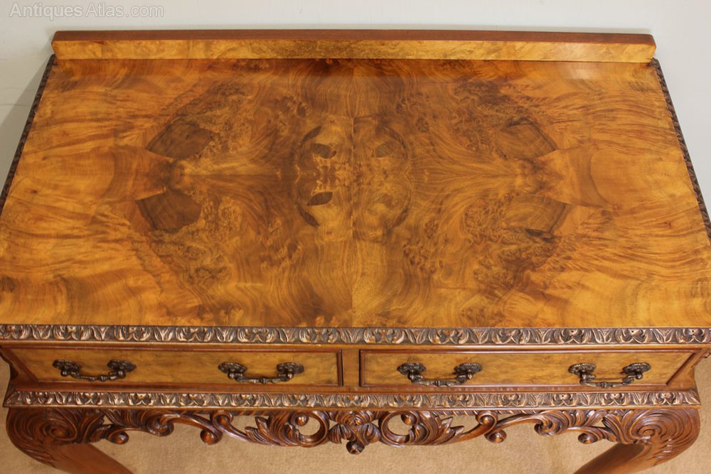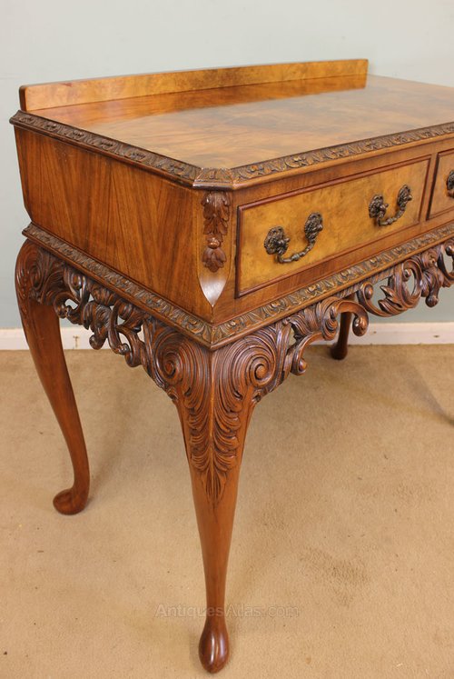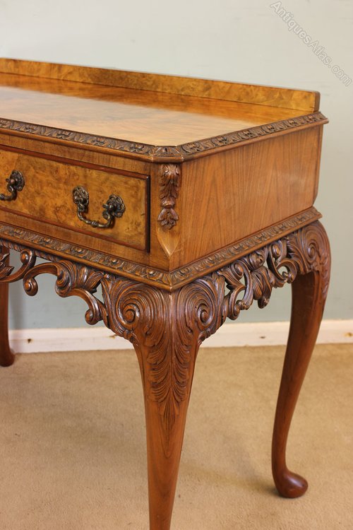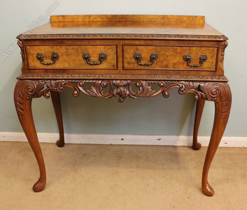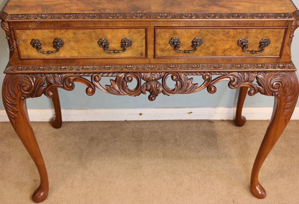 Antique 20th Century burr walnut two drawer side table. The table having lovely figured walnut top with carved edge and up stand, under having two burr walnut drawers with decorative handles either side having cantered corners with carved detail. The table is supported by carved Queen Anne style legs with lovely pierced and carved frieze.