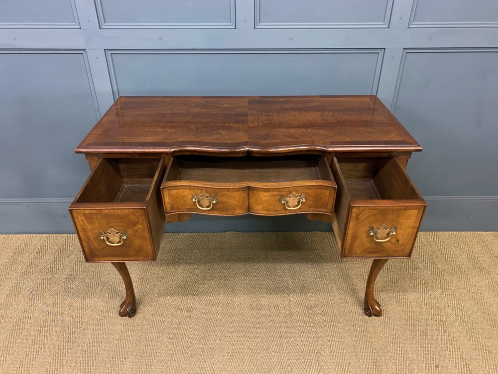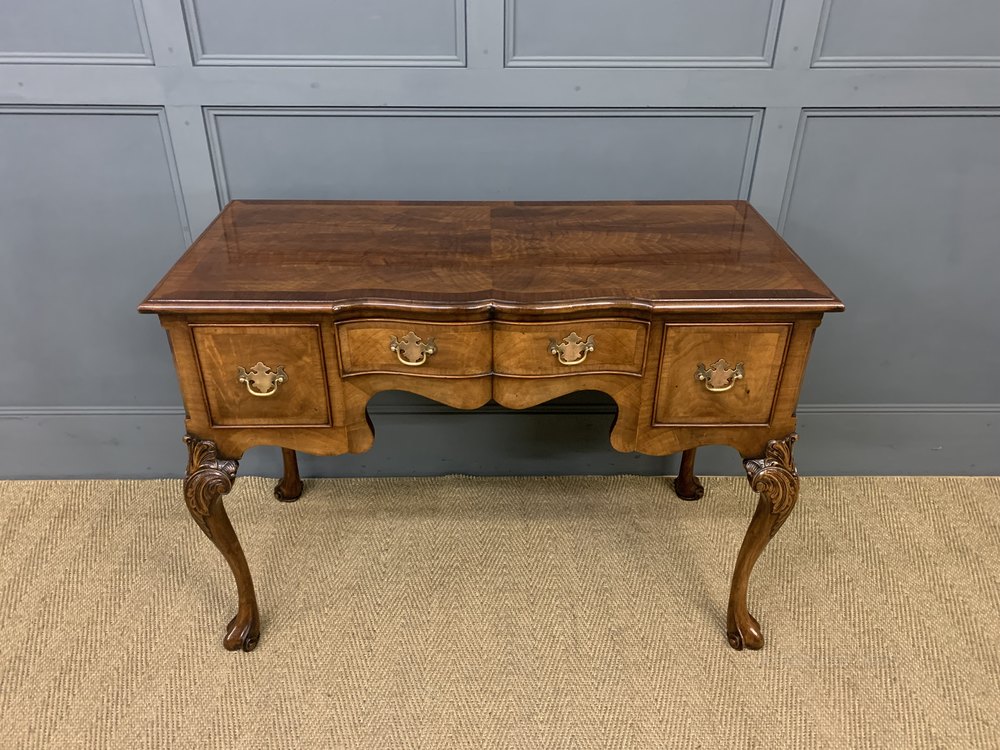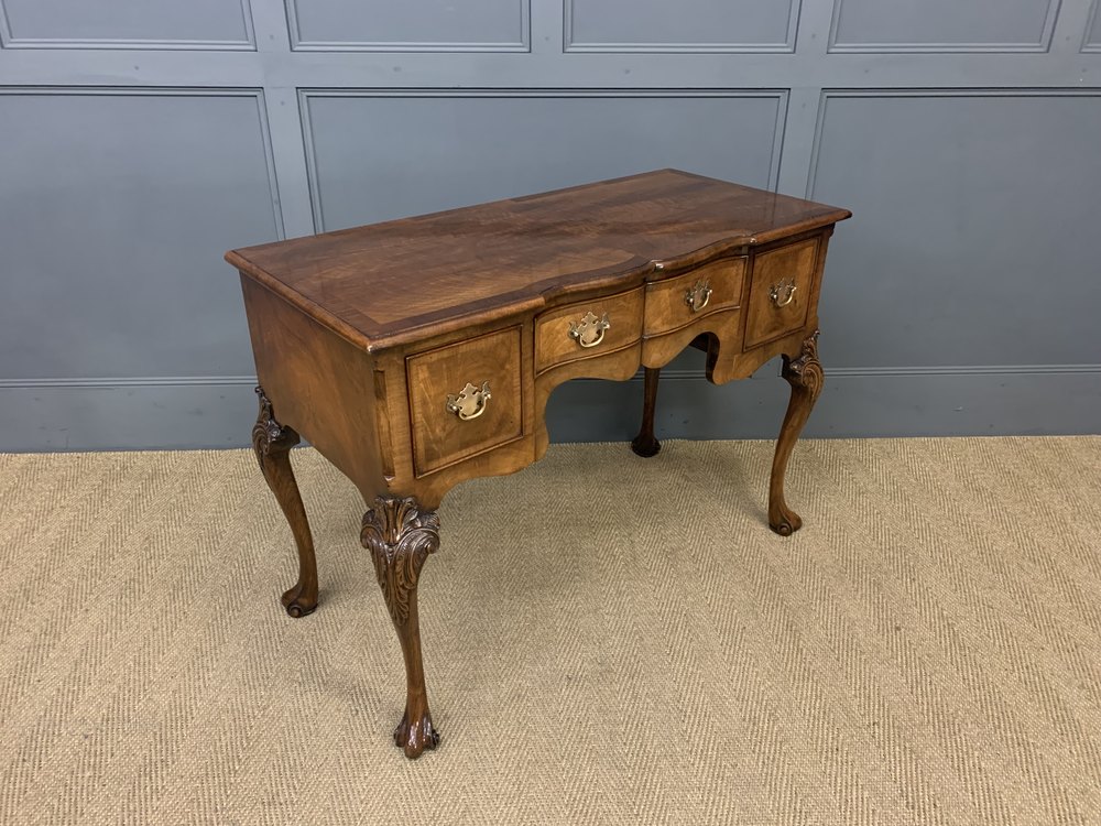 A very good queen Anne style burr walnut side table / lowboy by Maple and Co of London. Excellent construction in solid walnut with attractive burr walnut veneers. With an arrangement of 3 drawers , all fitted with their original solid brass handles. The shaped front top and the drawer fronts are all cross banded. Standing on elegant cabriole legs with stylised feet and carved decorations to the knees. Sympathetically refinished in our workshops and now offered for sale in excellent condition. This attractive table would sit well within a number of different room scenarios within the modern home.
