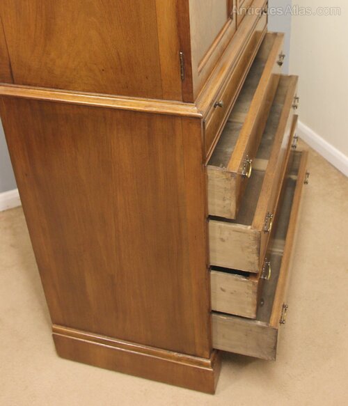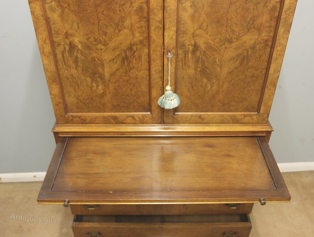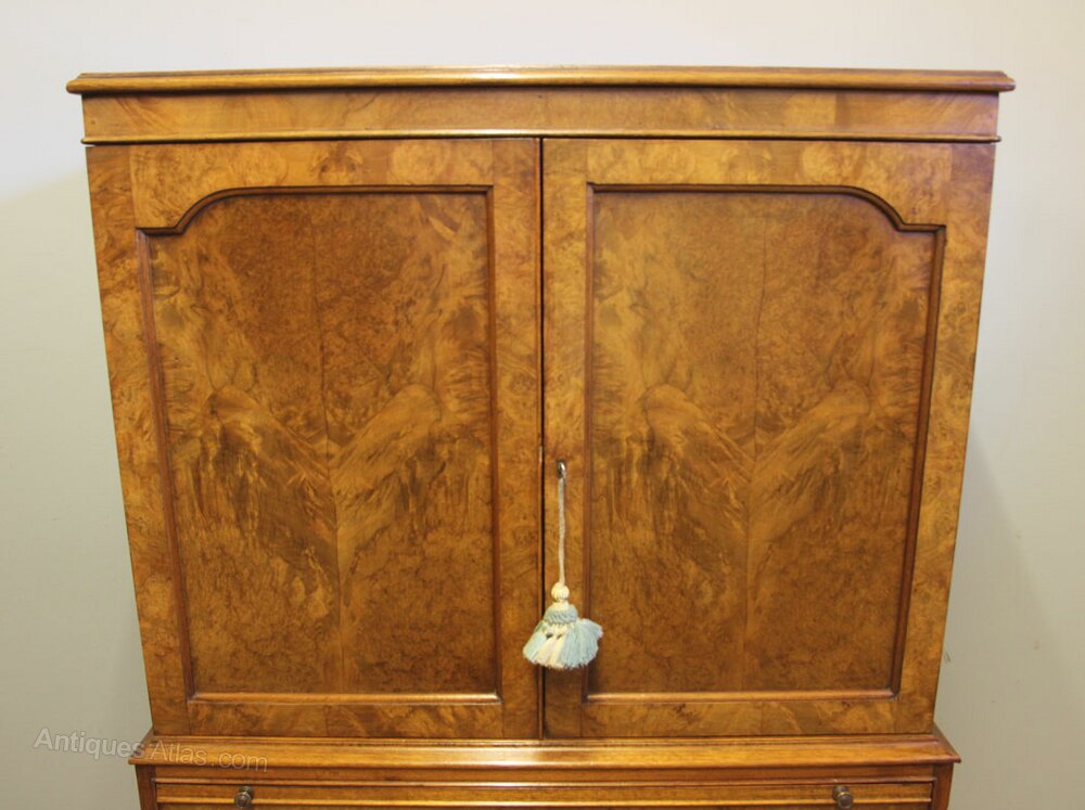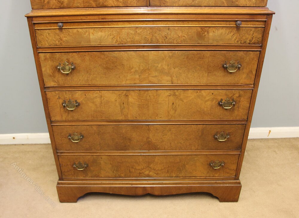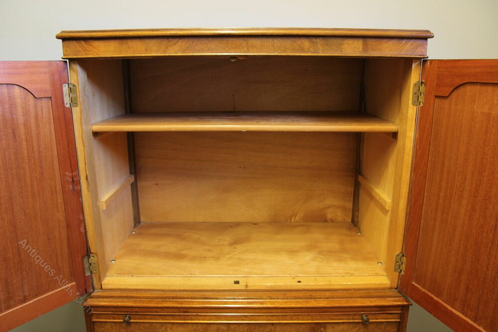 Burr Walnut Tallboy Chest Drawers, Drinks Cabinet. This lovely burr walnut tallboy / chest drawers / drinks cabinet has a moulded edge top edge with a pair of wonderful burr walnut doors under the interior having one shelf. Under having a pullout slide with four drawers under all fitted with brass handles and all supported by a solid plinth base.