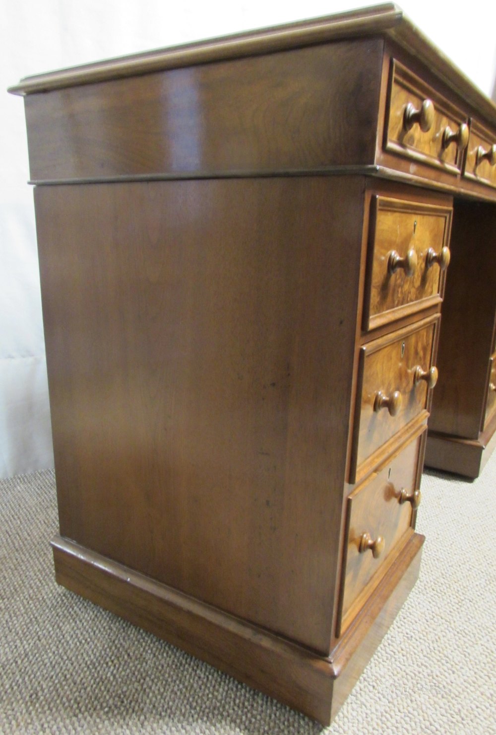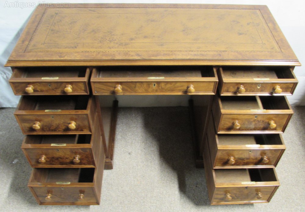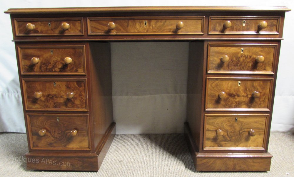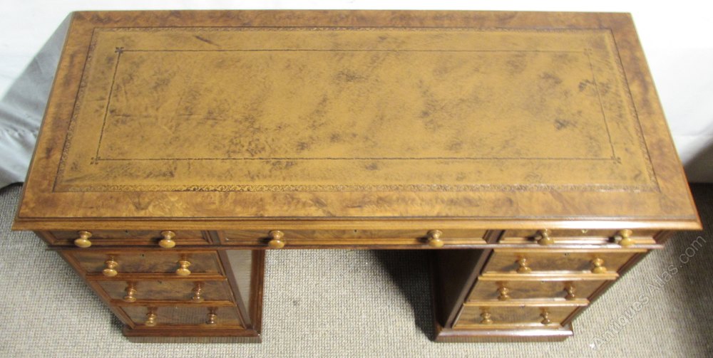 A nicely proportioned Victorian Pedestal Desk, in Walnut with nice tight Burr Walnut to the top and Drawers. All of the 9 drawers run smoothly and fitted with original handles. The leather in the top has been replaced with a new sumptuous tan coloured leather. The back of the desk is polished so could be free standing in a room.